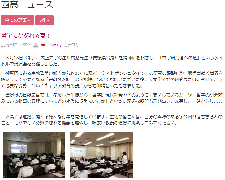 今年(2023年)8月23日(水)に、愛媛県立今治西高等学校にて、人文学科の星川啓慈先生による講演会が行われました。