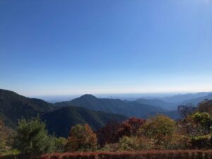 まず山道を進み、展望台に到着しました。ここでは周囲を囲む山々や鮮やかな紅葉を眺めることができ、大自然の美しさを堪能しました。