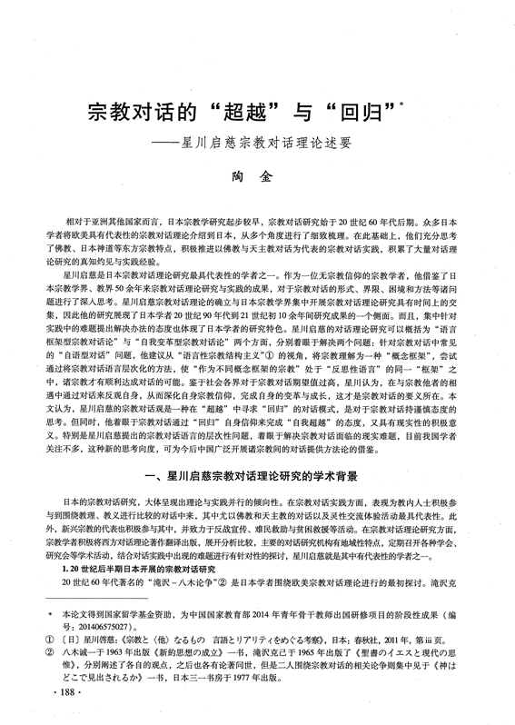 (2)『世界宗教研究』(2016年、第1期)には、陶金氏の論文「宗教对话的“超越”与“回归”——星川启慈宗教对话理论述要」が掲載されました。日本語に訳すと、「宗教間対話の『超越』と『回帰』――星川啓慈の宗教間対話理論の要点をめぐる論述」となります。星川教授の「宗教間対話理論」について論じられています。