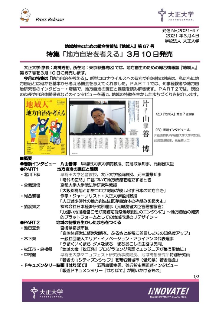 大正大学では、地方創生のための総合情報誌『地域人』第67号を3月10日に発売します。