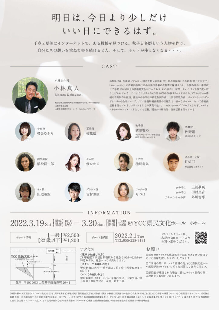 外川智恵准教授(表現文化学科)が3月19日(土)、20日(日)に@YCC県民文化ホール(山梨県)で上演された音楽劇「YOU CAN FLY!~明日を信じて~」に出演しました。※外川智恵准教授について