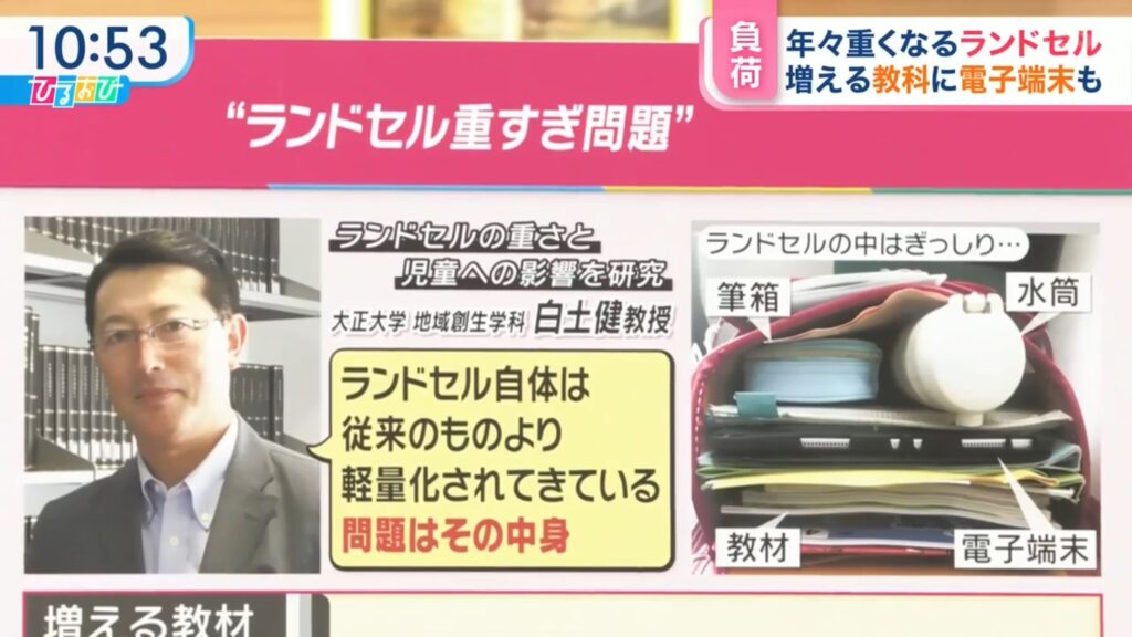 白土健教授(地域創生学科)が6月7日(火)放送のTBS「ひるおび」に出演しました。番組内で「ランドセル症候群」の問題を取り上げ、年々重くなるランドセルについて、白土健教授が専門家としてコメントをしました。