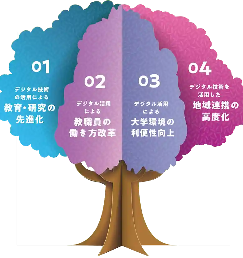 統合した情報資産をデジタルにより教育・大学生活へ活用し、生涯を通じた学び・挑戦の機会を提供する大学