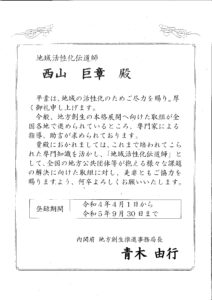 【教員の活躍】西山巨章教授(地域創生学科)が「地域活性化伝道師」に任命されました