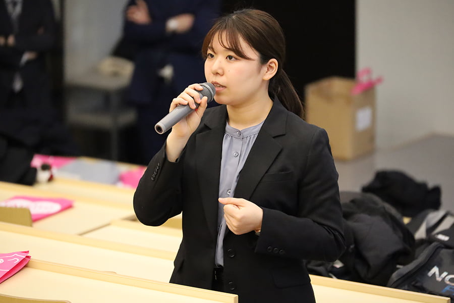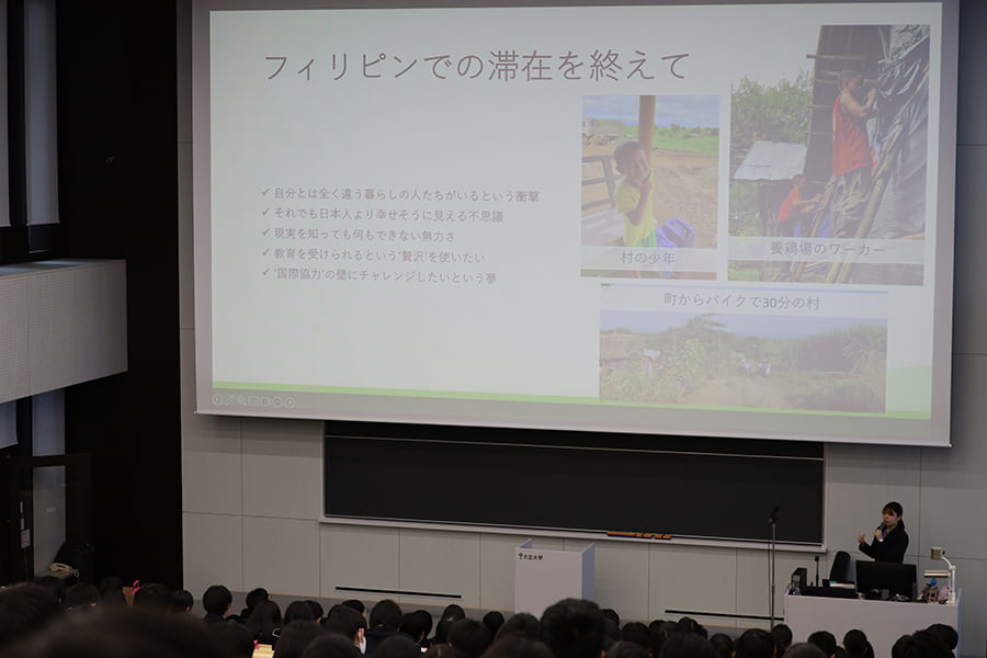 赤野間さんは「フィリピンでの海外インターンシップにおける体験」を中心に発表。ゴミ問題や大気汚染といった、現地が抱える社会課題について紹介するとともに「皆さんが調査に向かうマレーシアにおいても、どのような現実と課題があるのか、よく考えてみてほしい」と投げかけました。