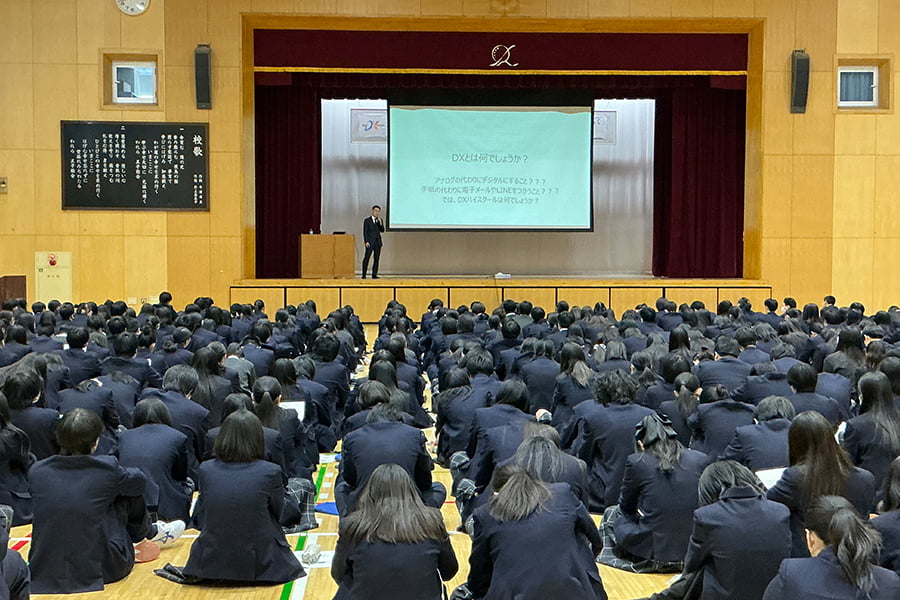 具体的には『王子総合DXハイスクールに寄せて—デジタルで未来を切り拓く—』と題して「DXとは何か」、「デジタル人材が求められる理由」、「IoTとAIによる社会の変革」などについて解説。さらに生徒の皆さんの進路選択を見据えて、理学と工学の違いや、文系・理系を区別せずに横断的に学ぶ「文理融合」の重要性についても語りました。