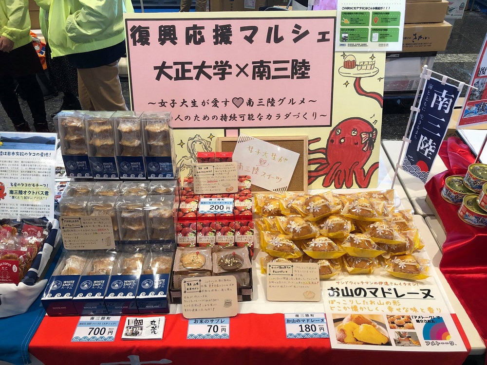 本学の学生たちはオレンジや黄色のジャンパーを着て、学生たちが企画した「女子大生が愛す❤︎南三陸スイーツ」と「忙しい人のための持続可能なカラダづくり」をテーマとした物品を中心に特産品を販売したり、観光PRブースではなぜ南三陸と大正大学がつながっていのるかを紹介したりしました。