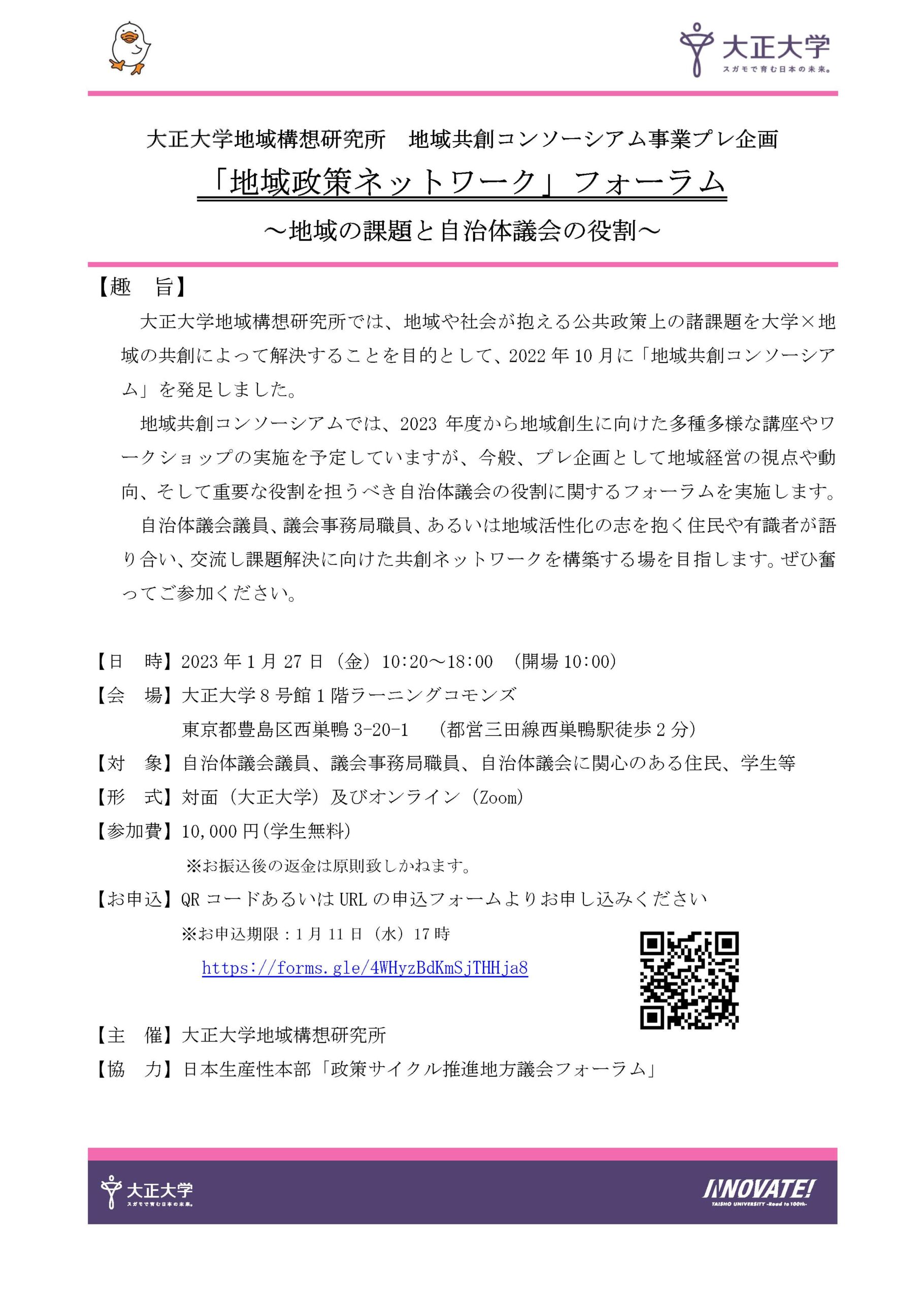 地域共創コンソーシアムでは、2023年度から地域創生に向けた多種多様な講座やワークショップの実施を予定していますが、今般、プレ企画として地域経営の視点や動向、そして重要な役割を担うべき自治体議会の役割に関するフォーラムを実施します。
