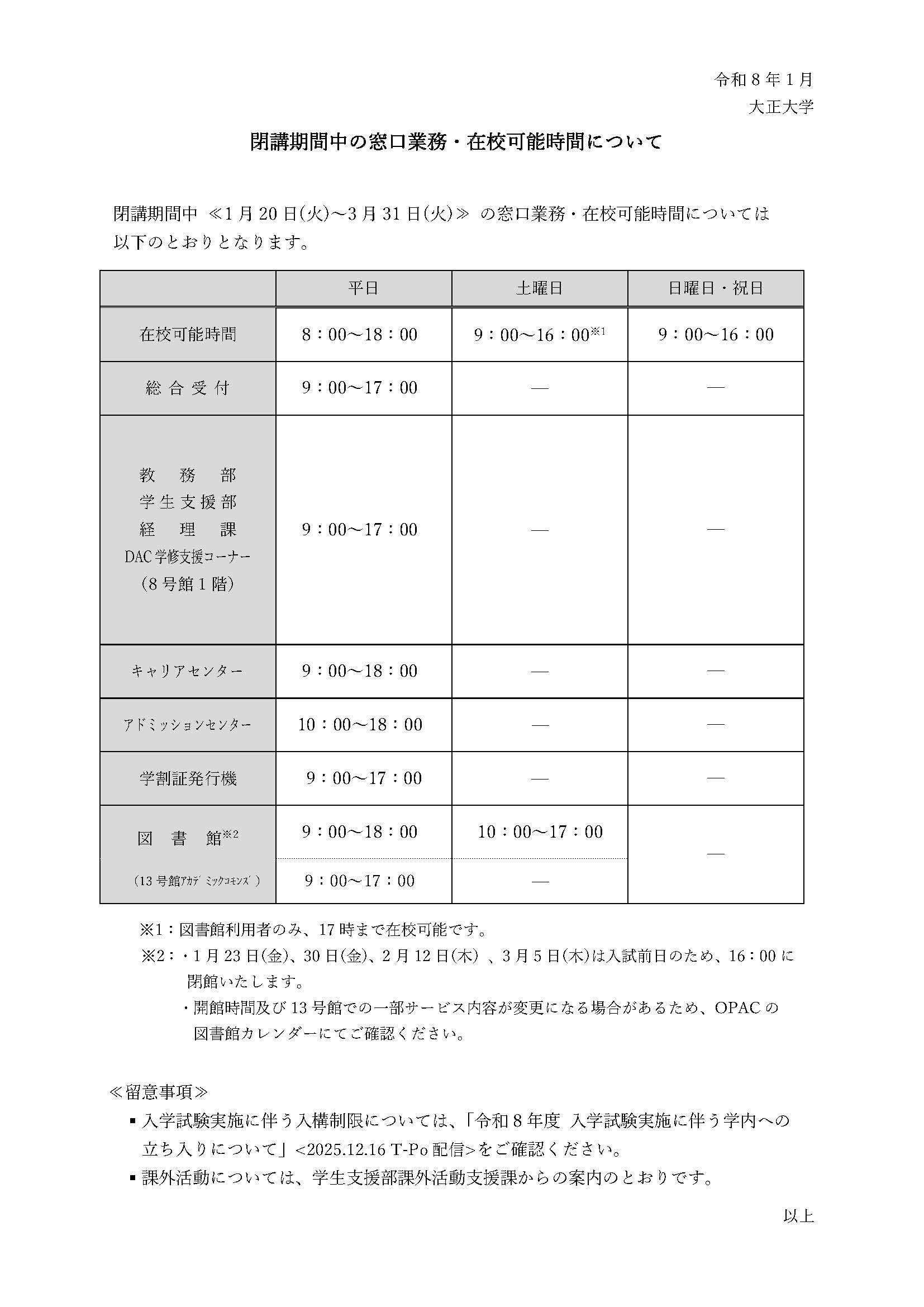 令和 8 年度 閉講期間中の窓口業務・在校可能時間について