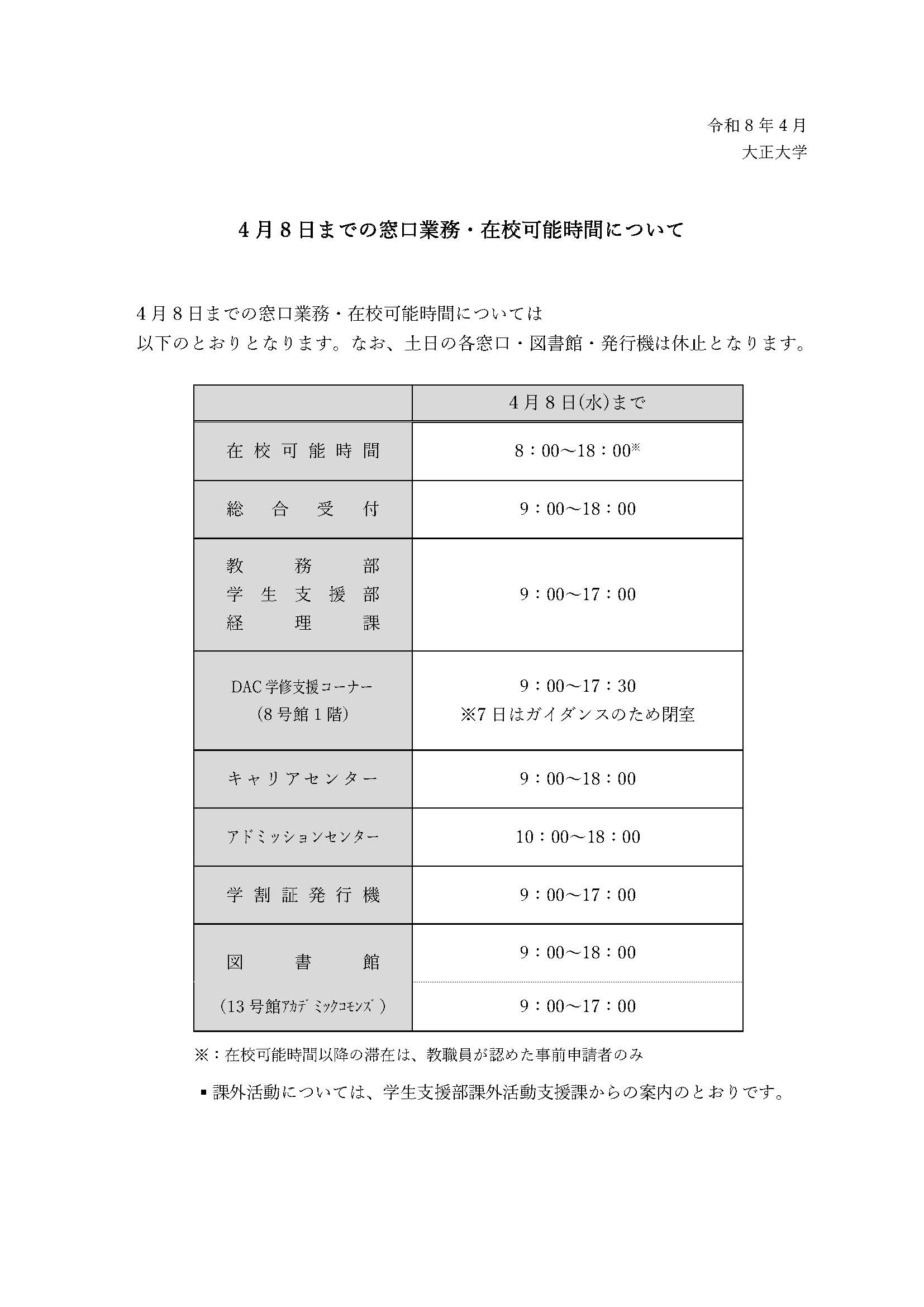 4 月 8 日(水)までの窓口業務・在校可能時間について