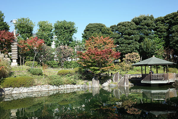 This is Mejiro Garden, which opened as a brand-new Japanese garden in 1990. When you go through the front gate, take a breath, and look from the Rokkaku-Ukimido rest spot on your right to the graceful form of the Sekicho-an, built in the style of a tea ceremony arbor from Kyoto Kitayama cedar trees, you will forget that you’re in the middle of the city.