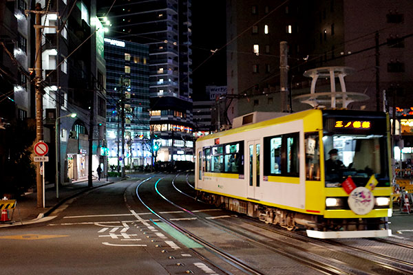 A tram car from the Toden-Arakawa Line passes through the Otsuka area at night.