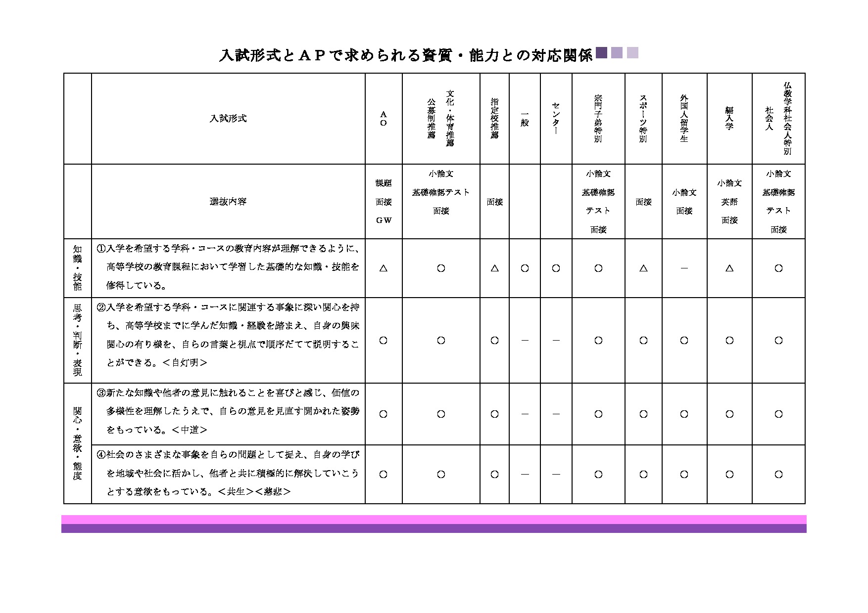 1. AP2:高等学校までに得た知識・経験を入学希望の学科・コースの学びに結びつけて説明することができる。
