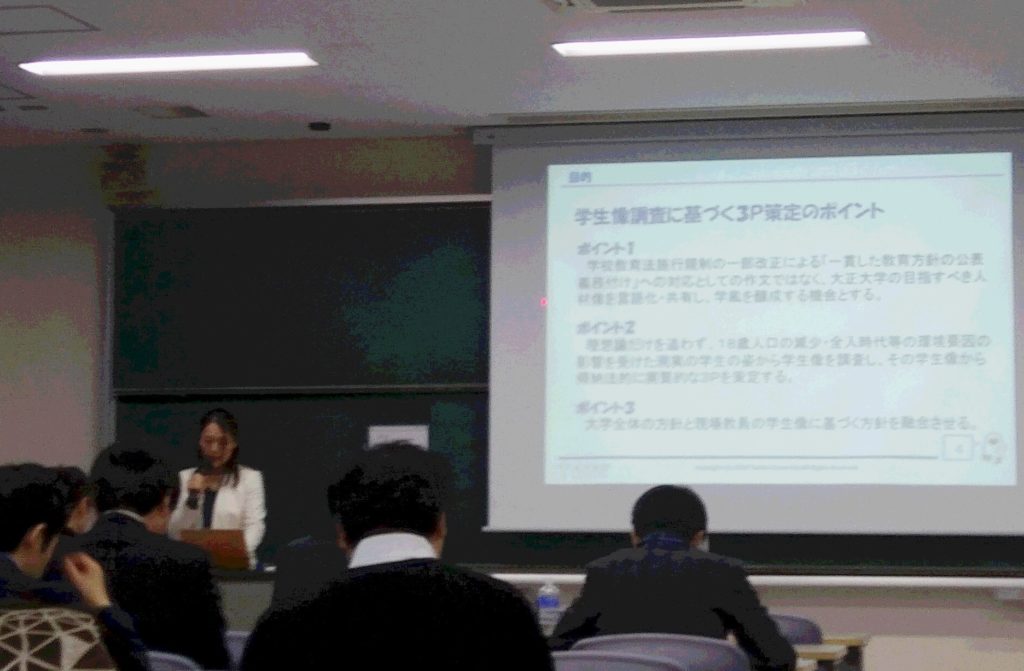 教育研究フォーラムでは、大学を取り巻く様々な環境要因の影響を受けた現実の学生像を調査し、各学科・コースの学びをより高度に達成しつつある実在の「学生像」から、帰納法的に3Pを策定した大正大学の取組みの具体的な手順とその効果と課題について発表しました。