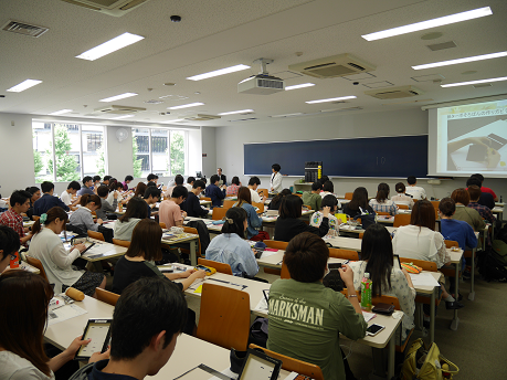 また、『紙ターボそろばん』を組み立ててそれを使って英語で読み上げ算を行ってくださいました。さらに、学生たちの脳の活性化が図られたように思います。(2018.5.16) 畠山仁男
