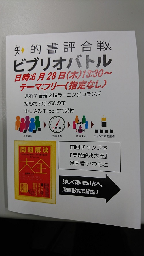 今月6月28日(木)13:30~開催予定のビブリオバトルのチラシを作成しました。