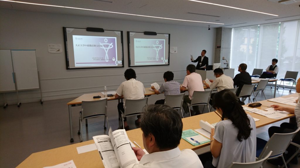 大正大学で実施しているキャリア支援のひとつである1・2年生必修科目の基礎技法Aと、就職課にて行っている就職支援サービスの紹介、またそれら支援の連動についても説明がありました。