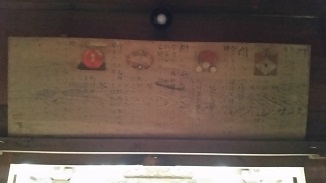 算額がある本学ゆかりの寺院で、世界遺産・浄土の国平泉にある天台宗東北大本山関山中尊寺などを調査してきました。関係する資料では、中尊寺の中にある地蔵堂と阿弥陀堂に算額があるとのことでしたが、阿弥陀堂正面入り口裏側頭上に飾られていました。外観からでは見ることができず、ご許可をいただき案内まで賜り内部に入り写真撮影させていただきました。お忙しい中を誠にありがとうございました。