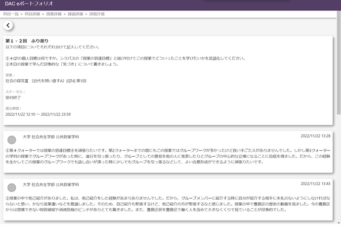 チューターは、担当授業学生の「ふり返り」に目を通して、コメントを返したり、授業での