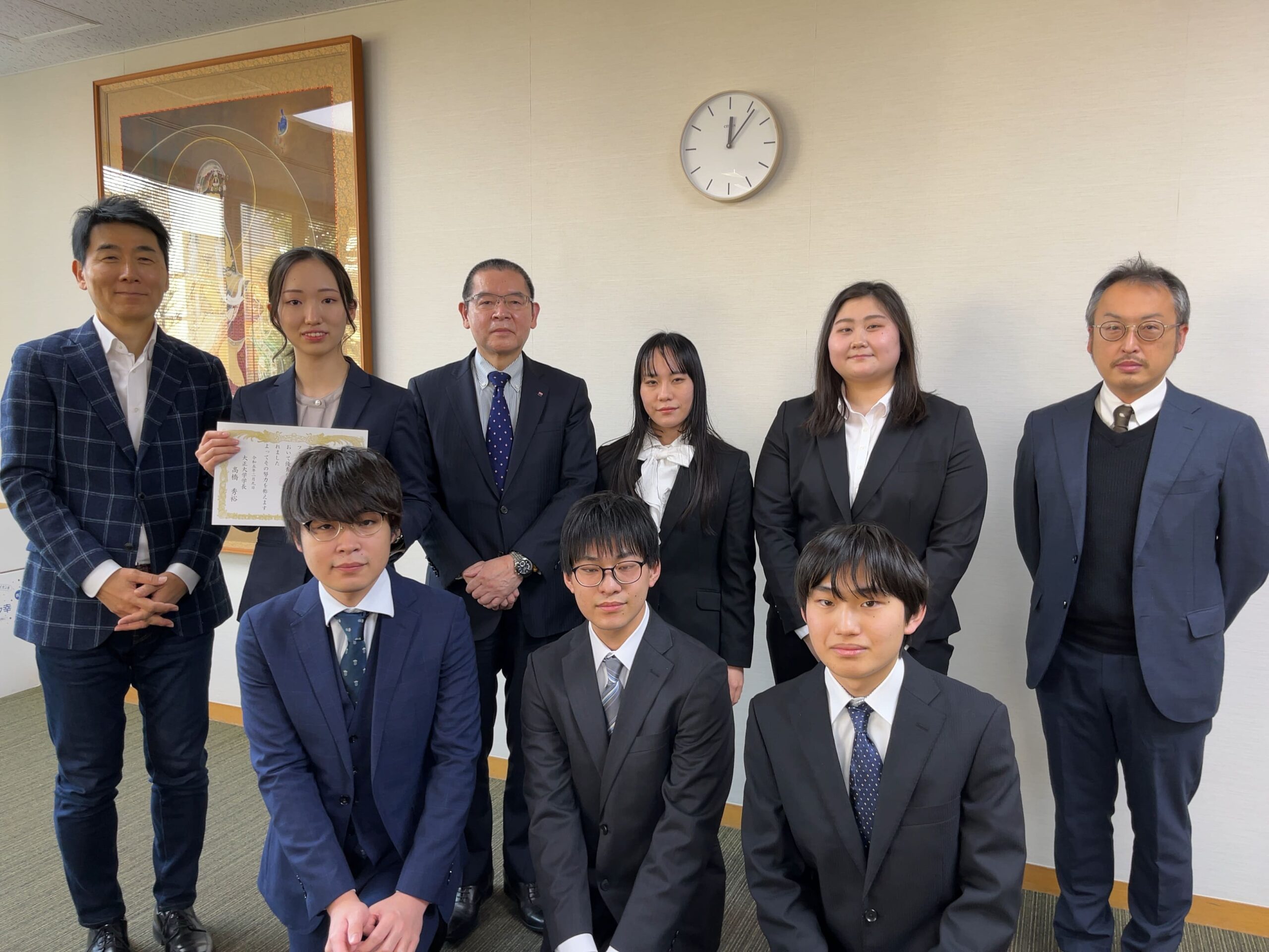 「社会の探究」は大正大学の1年生が必ず履修する共通教育科目、「第Ⅰ類科目」の1つであり、「表現力」や「対人力」、「地域密着力」を育むことを意図してカリキュラムデザインされた科目です。「社会の探究」では、変化のはげしい現代社会について、問題解決のプロセスに即して学んでいきます。授業内ではグループワークを多く実施しており、第4QTの最終回には大学の立地を活かして、地域の課題解決をテーマとしたグループプレゼンをおこないます。プレゼン(ファイナルプロジェクト)では、優秀なプレゼンをおこなったグループに学長賞・副学長賞が授与されることになっており、去る2月9日、授与式が開催されました。