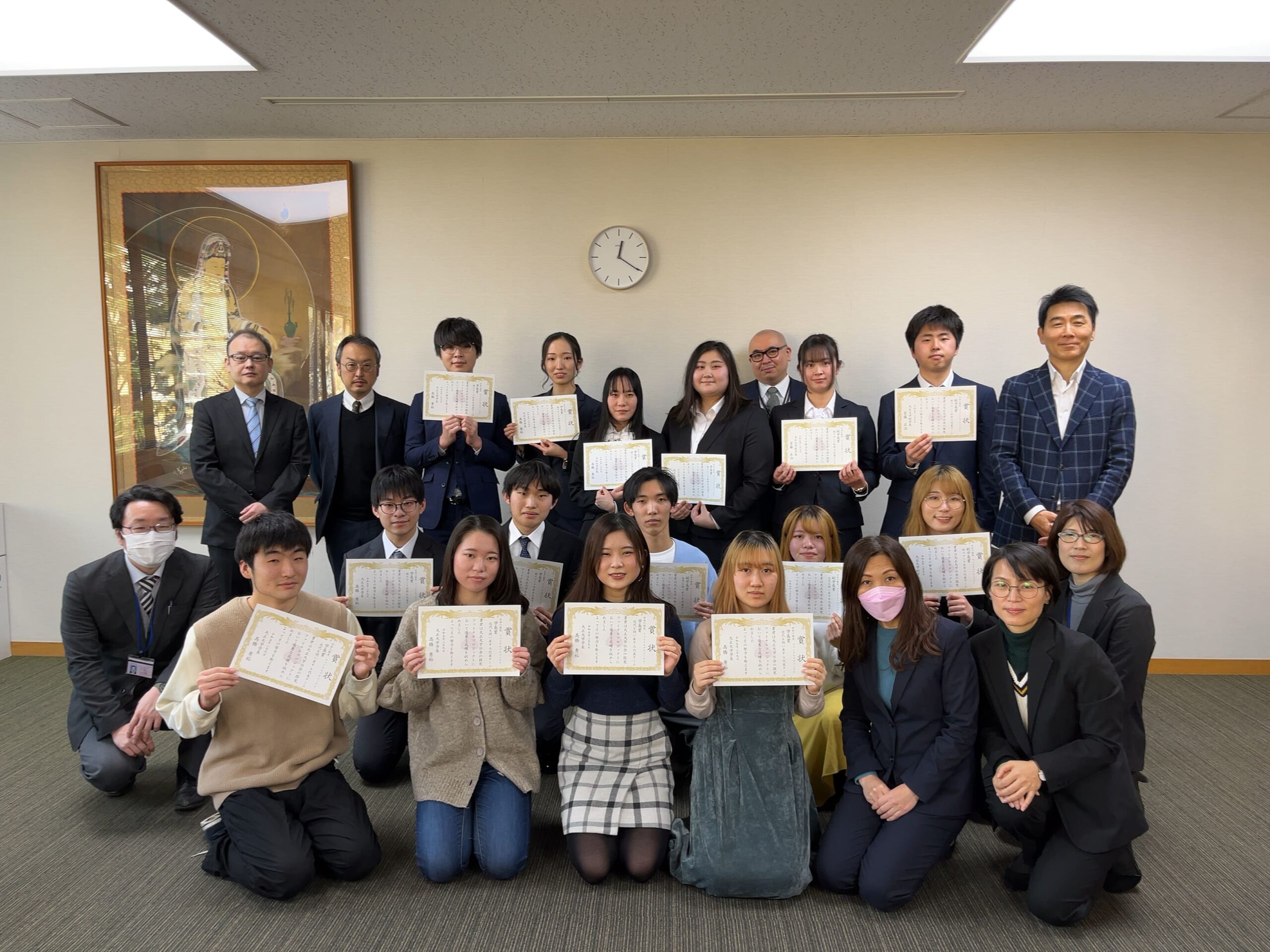 さて、当日の様子ですが、授業開講期間でないにもかかわらず、当日は15名の学生が授与式に参加しました。どの学生も晴れやかな表情で賞状を受け取り、学長、副学長、授業担当の先生方やチューターと共に記念撮影をおこないました。