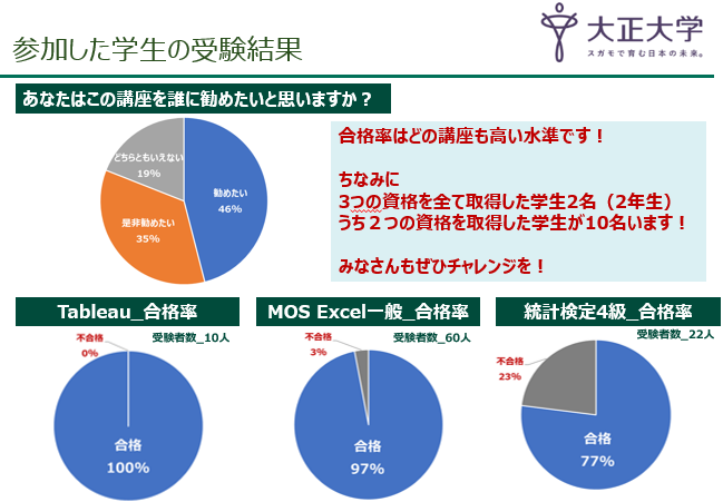 特にTableauやMOSの資格試験に関しては、ほとんどの学生が合格することができました。