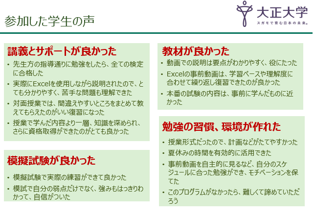 夏休みの特別プログラムを受講した学生の資格試験の受験結果と、参加学生の声をご紹介します。