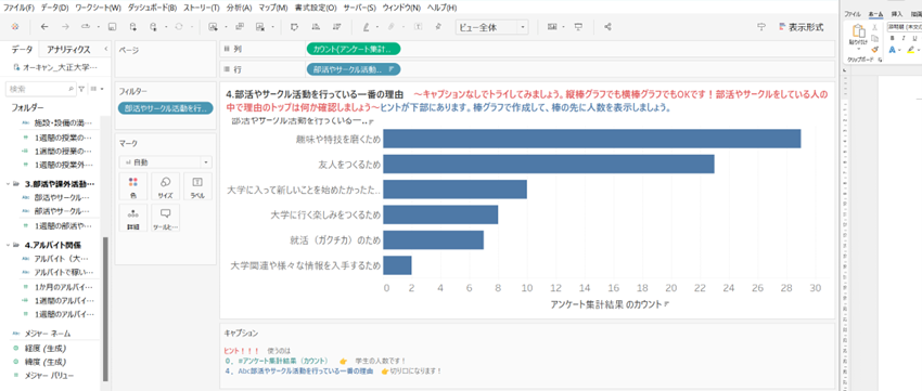 「Tableau」の操作画面及び体験型学習で作るビューの例