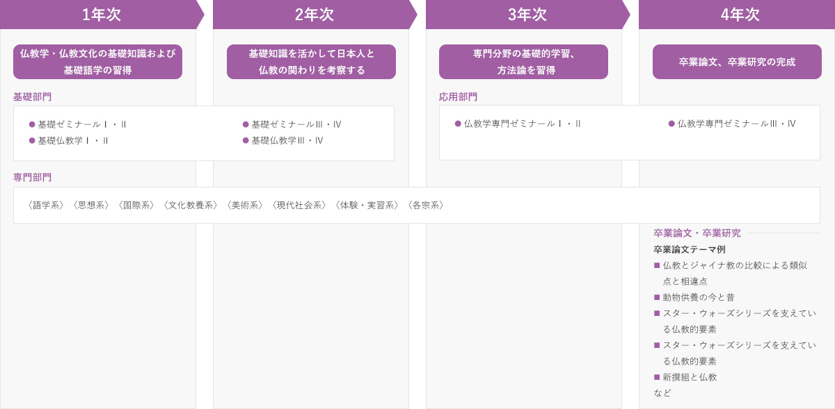 1・2年次は、インド仏教や大乗仏教、中国仏教、日本仏教をそれぞれ学びます。並行して、仏教典籍に用いられる漢文やサンスクリット語、チベット語、パーリ語など学修。仏教学研究の基礎を築きます。そして3・4年次には、各人の興味に応じて思想系、美術・文化・教養系、現代社会系などを専門的に学び、卒業論文・卒業研究につなげます。