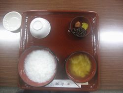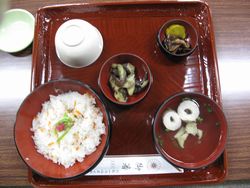 食事は精進料理です。朝食はお粥に味噌汁に梅干。昼食は炊き込みご飯に吸い物に小鉢。夕食は揚げ物やゴマ豆腐など小鉢が並びますが、どの食事にも必ずタクワン2切が付くのがミソです。