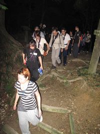 真っ暗の山道を、懐中電灯の明かりだけを頼りに歩くのです。比叡山の自然のなかで、夜の闇の暗さと霊気を感じながら、一歩一歩、歩くことだけに心が集中していきます。坐禅止観とは異なった、歩きながら三昧の境地に至る瞬間です。