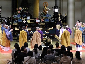 光明供錫杖法要とは、導師が中央の密壇において密教の光明真言供養法をおこない、かたわらの僧衆がその修法を助けるために「九条錫杖」という声明曲を唱えるもので、施餓鬼会や葬儀によく用いられます。