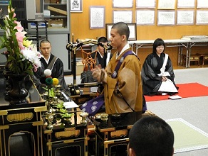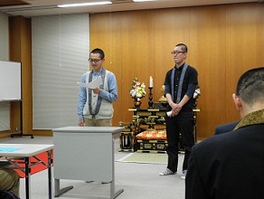 今年は法要終了後にボランティア報告会を実施しました。震災後に何らかの形でボランティアにかかわった学生三組によって熱のこもった発表がなされました。被災地での復旧支援活動、東京での義捐金托鉢、いずれも学生はいくらかの課題をそこに見出しておりました。今後のボランティア活動のためにも有益な報告会になったのではないかと感じております。
