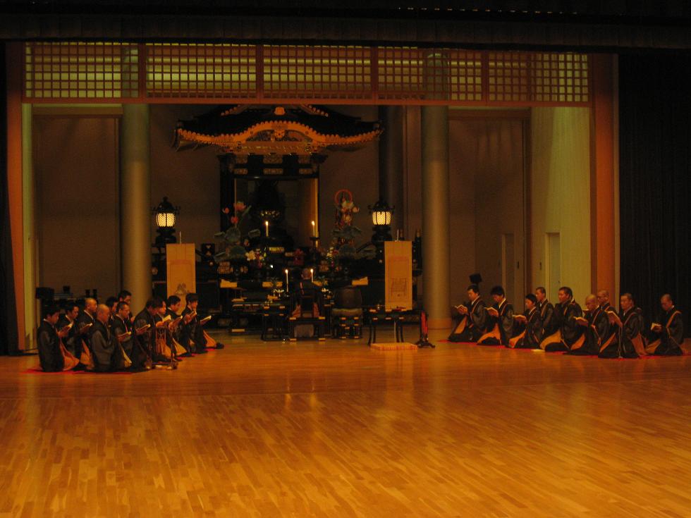 法要の全体。弘法・興教両大師の御影の前で、智山学生会が