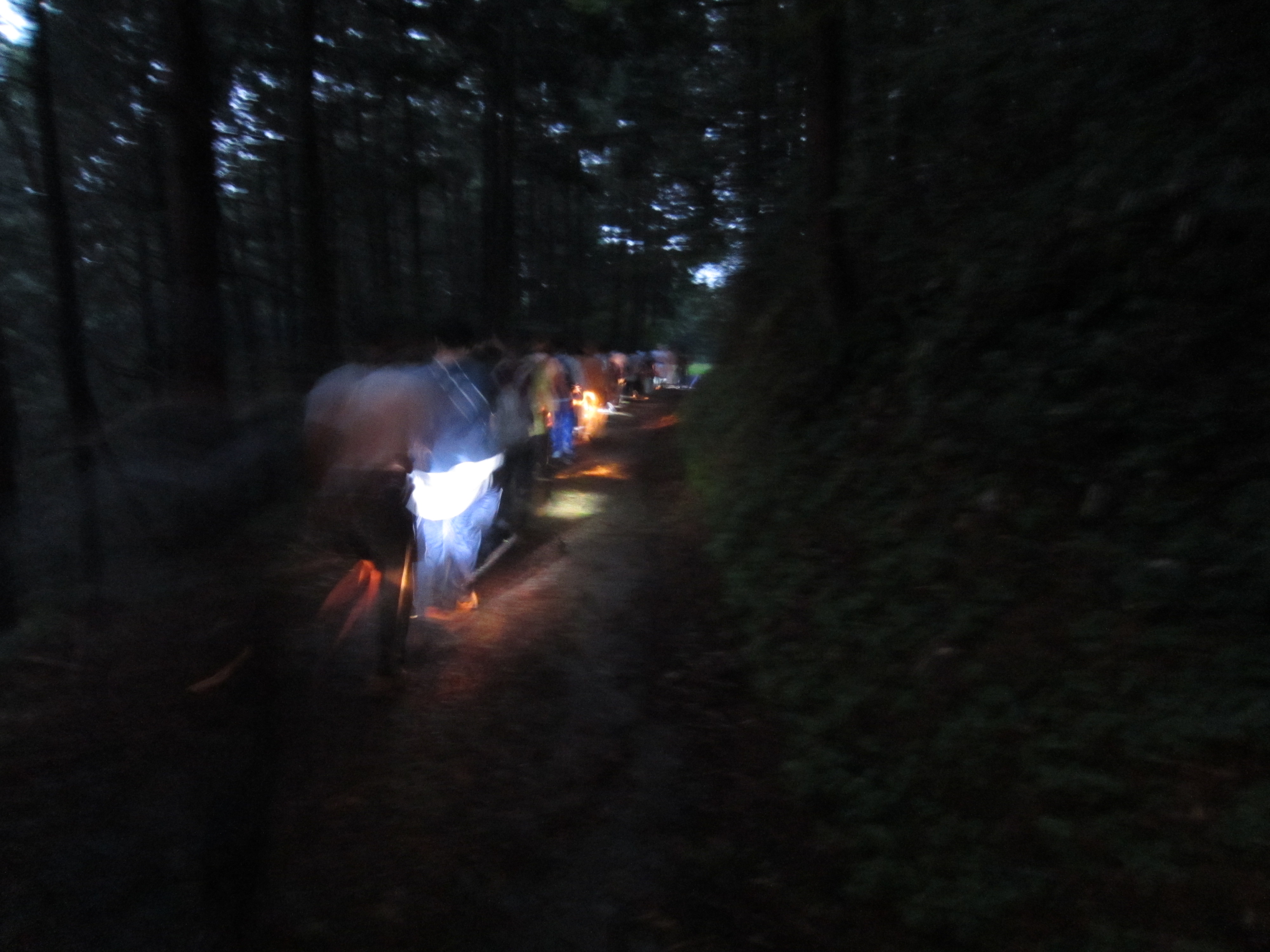 真っ暗の山道を、懐中電灯の明かりだけを頼りに歩きます。比叡山の自然のなかで、夜の闇の暗さと霊気を感じながら、一歩一歩、歩くことだけに心が集中していきます。坐禅止観とは異なった、歩きながら三昧の境地に至る瞬間です。