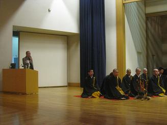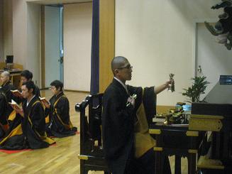 緞帳が上がると同時に奠供師の唱えるお経が礼拝堂内に響き渡りました。奠供とは仏さまを讃えるお経で、これに節をつけて唱えます。この唱え方を声明といいます。その後理趣経、不動讃もお唱えしました。