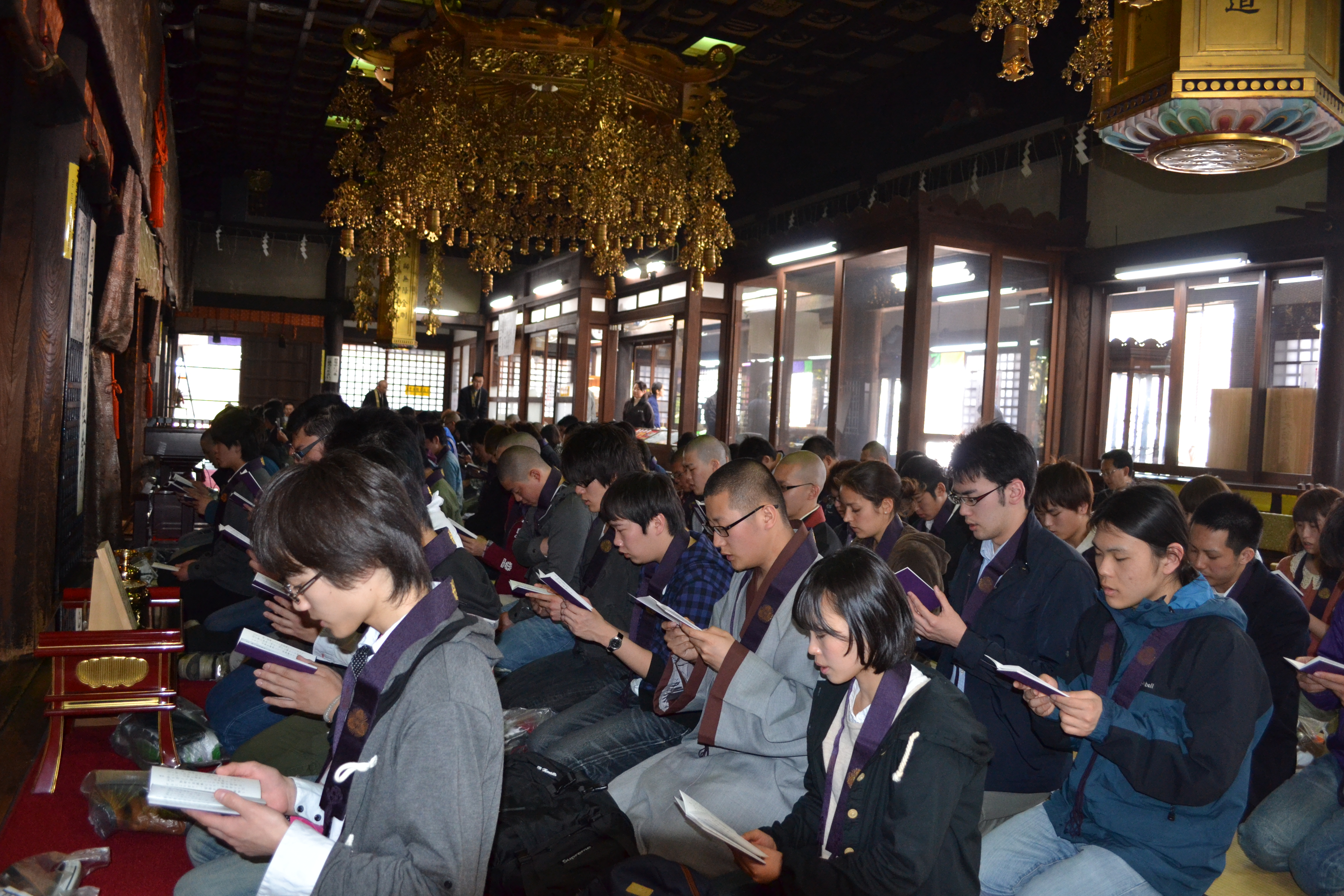 本堂に入り全員で「大正大学勤行式」によるお勤めを行った後、喜多院の塩入ご住職よりお話をうかがいました。