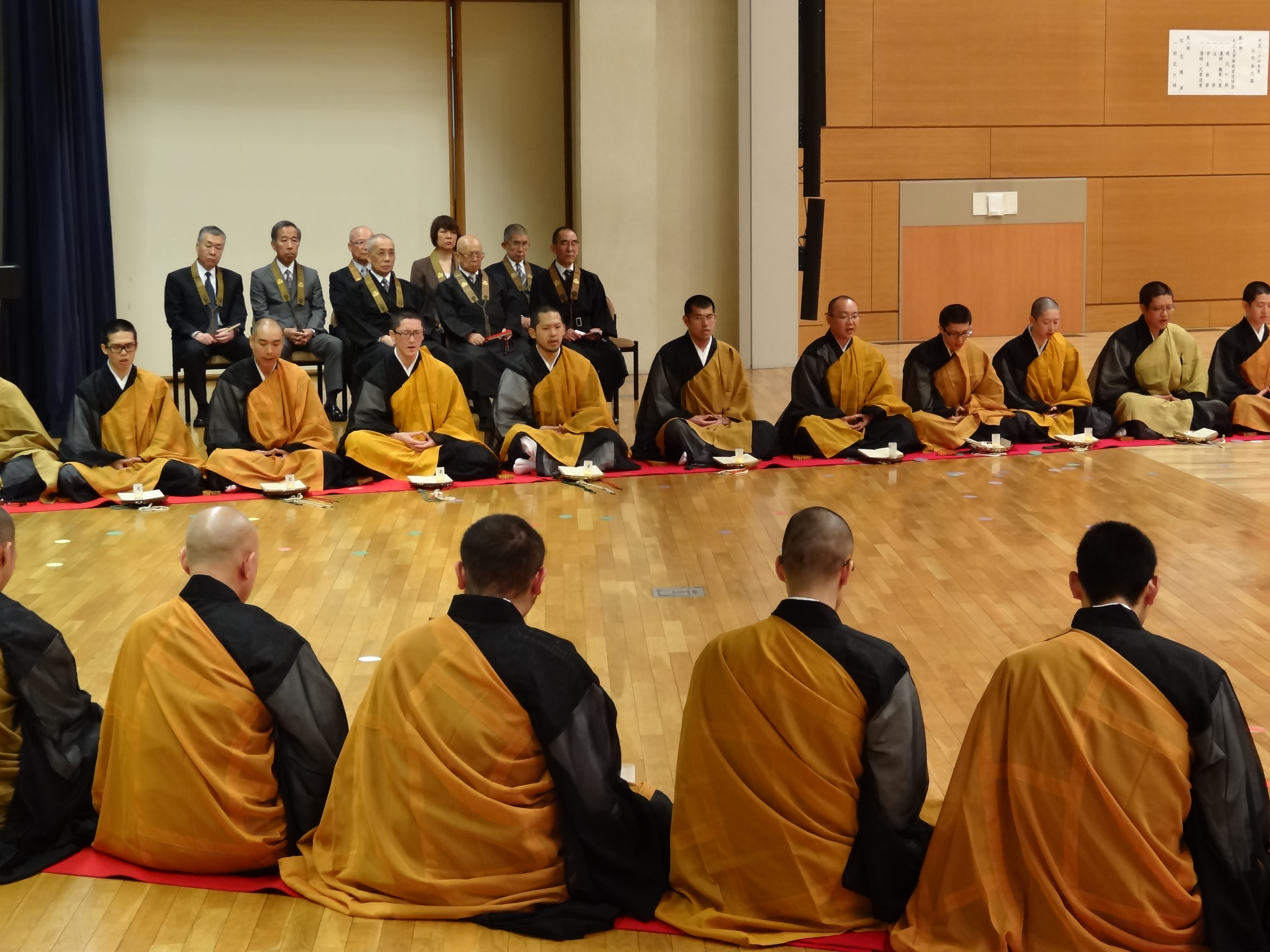 仏教学部長勝崎先生のご挨拶、雅楽部の演奏が終わった後、礼拝堂後方より2列に分かれて職衆が入堂し、