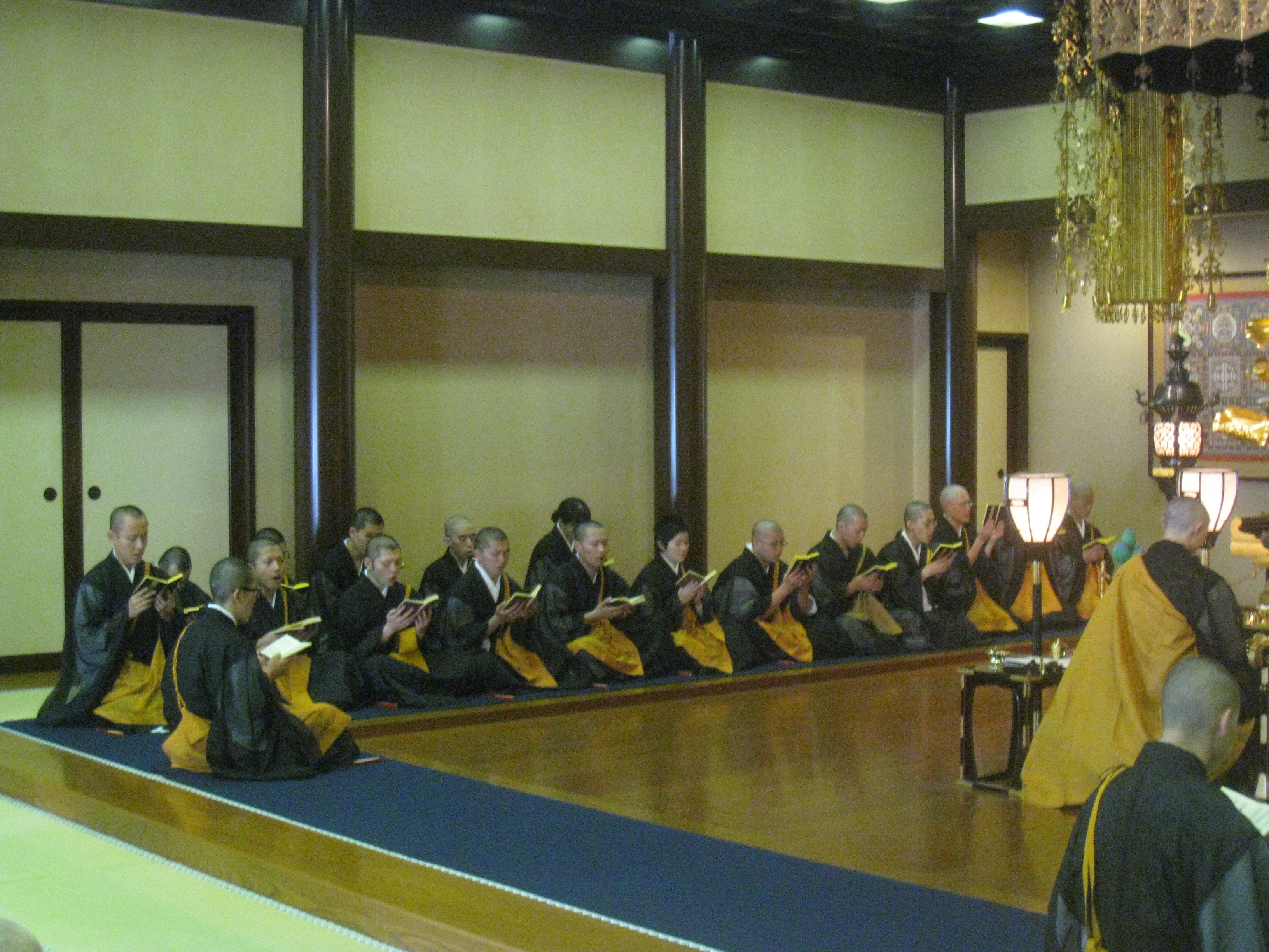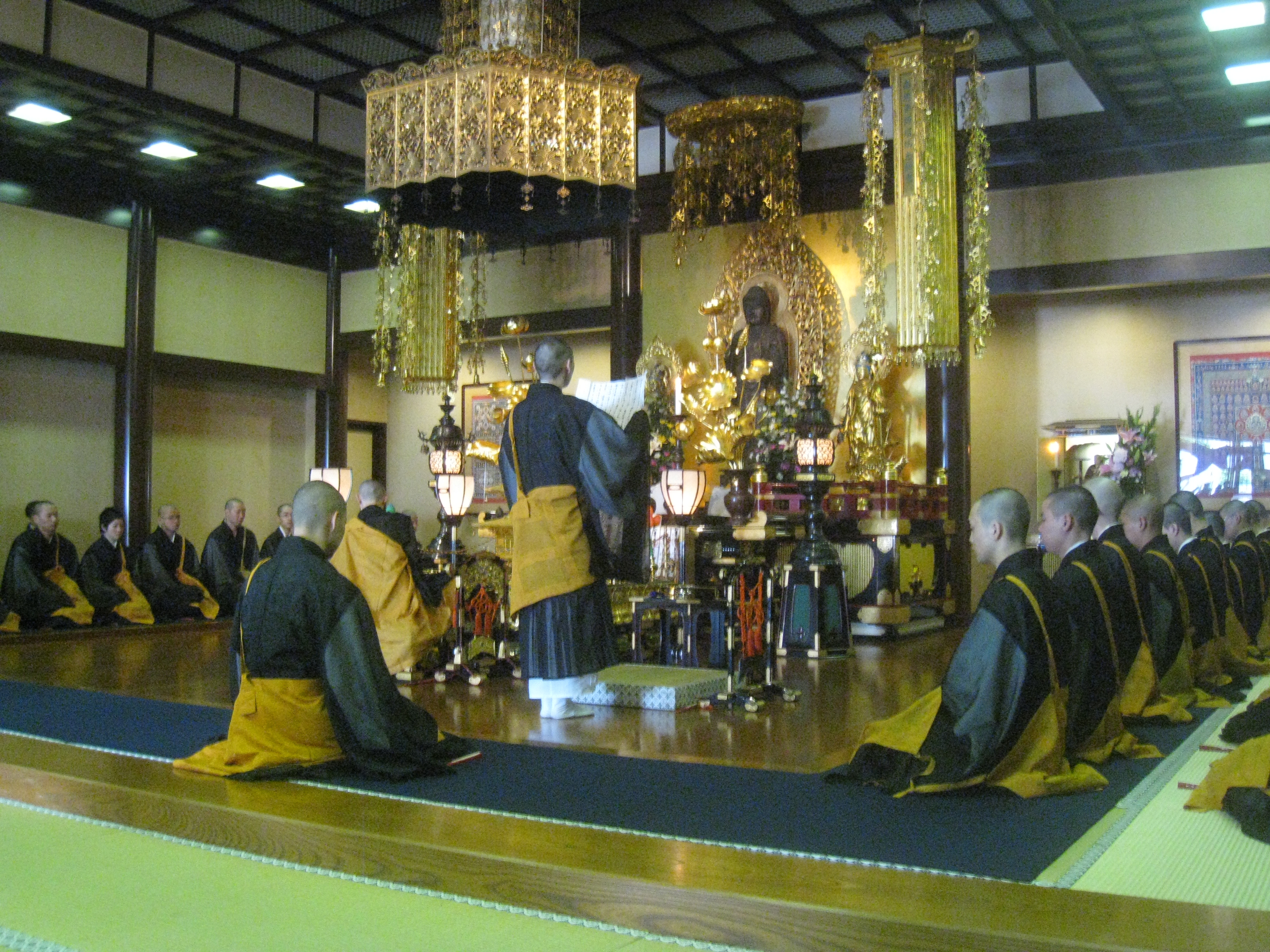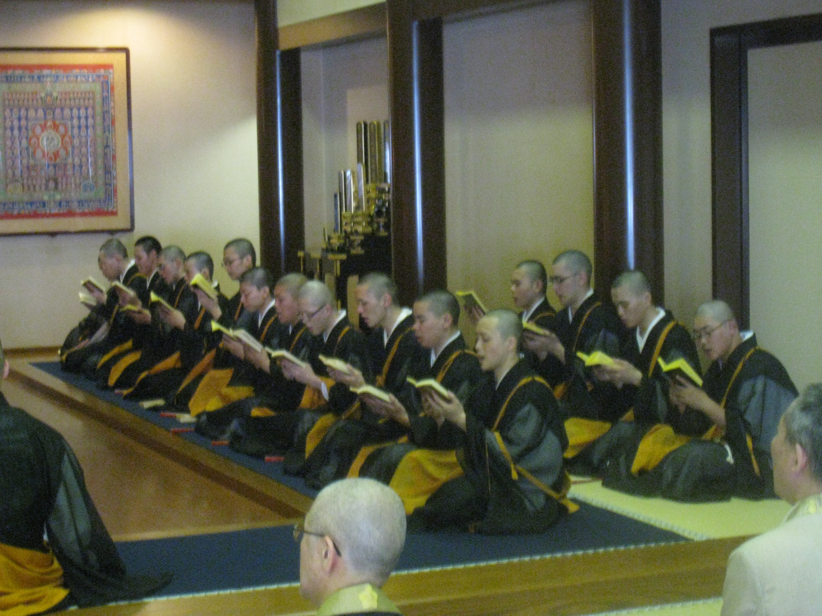 この日真言宗智山派の学生が、宗派の勉強を普段の机から道場に移して行いました。一年生にとっては初めての法要であり、緊張している様子が伝わってきましたが、一生懸命に唱えていました。出仕者全員が心をこめたお経は、堂内全体に響き渡り一体となっていました。