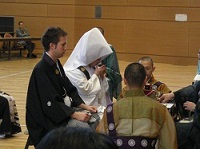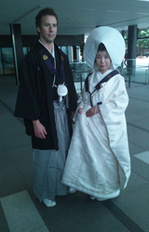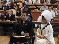今回の模擬結婚式の新郎役は表現文化学科コンシェルジュのリーバイ・ハンソンさん、新婦役は仏教学科4年生の平田みどりさんです。戒師(結婚式のお導師役)は本学教授・塩入法道先生が勤めました。