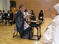今回は、この仏前結婚式を礼拝堂にて模擬形式で挙げました。新郎役・新婦役・仲人役も本学の職員や学生が勤めました。