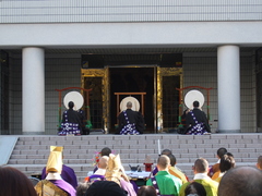 ◆12時25分、大正大学正門より校内へ。礼拝堂前で行なわれた成道会法要は、雅楽部による演奏ではじまり、お釈迦様の成道を慶讚し、あわせて参列の皆様の諸願成就と解禁となった就職活動の成功を祈念して、護摩供法要も修法されました。その後、六大響という太鼓の奉納、真言宗豊山派の学生会による大般若転読法要がそれぞれ厳修されました。