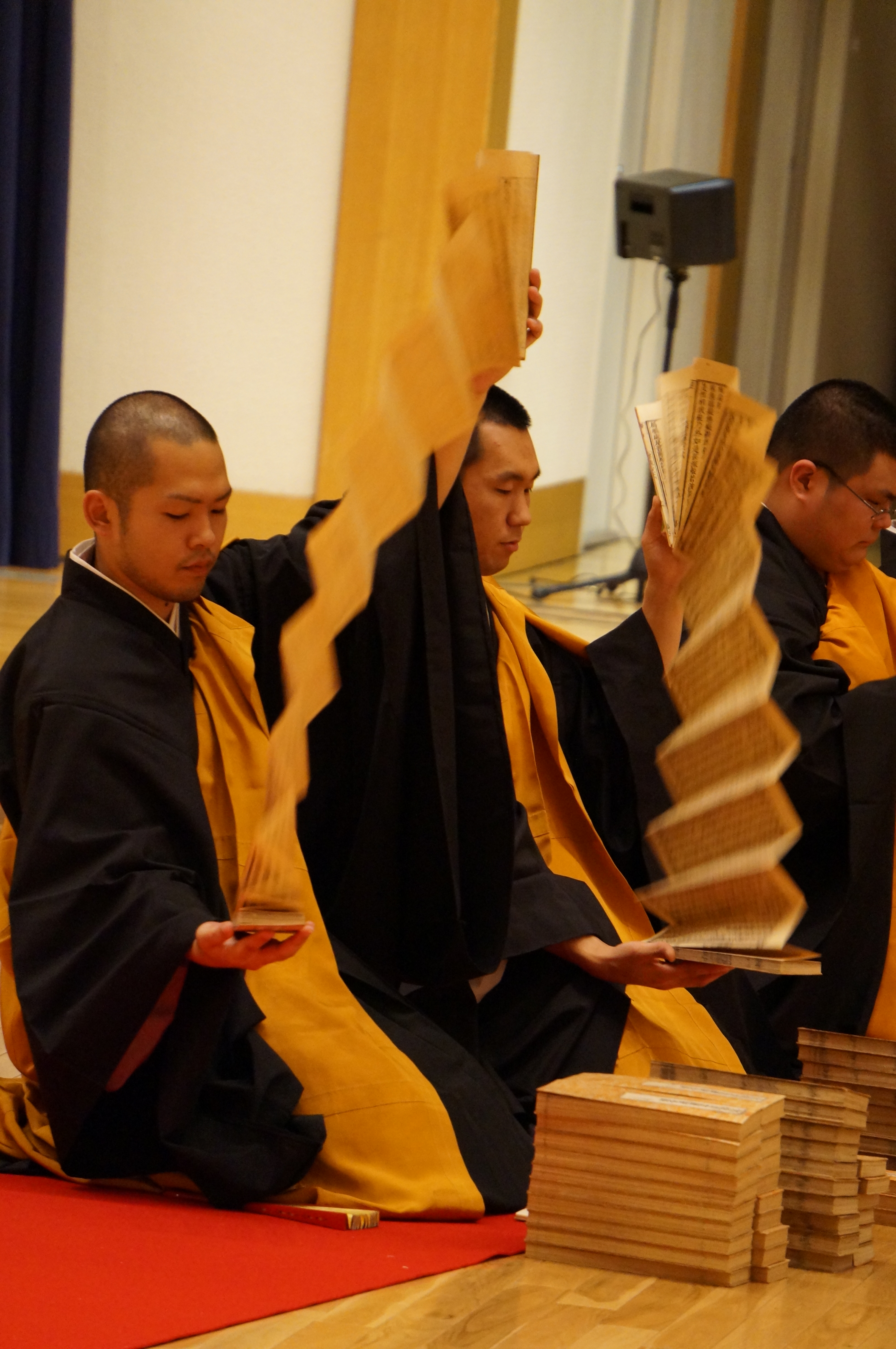 この法要は、この大般若経600巻を複数の僧侶で転読し、五穀豊穣等を祈願するものです。転読とは一般のお経の読誦のように声をだして一文字一文字読まず、経本を1巻1巻広げ流し読むことです。