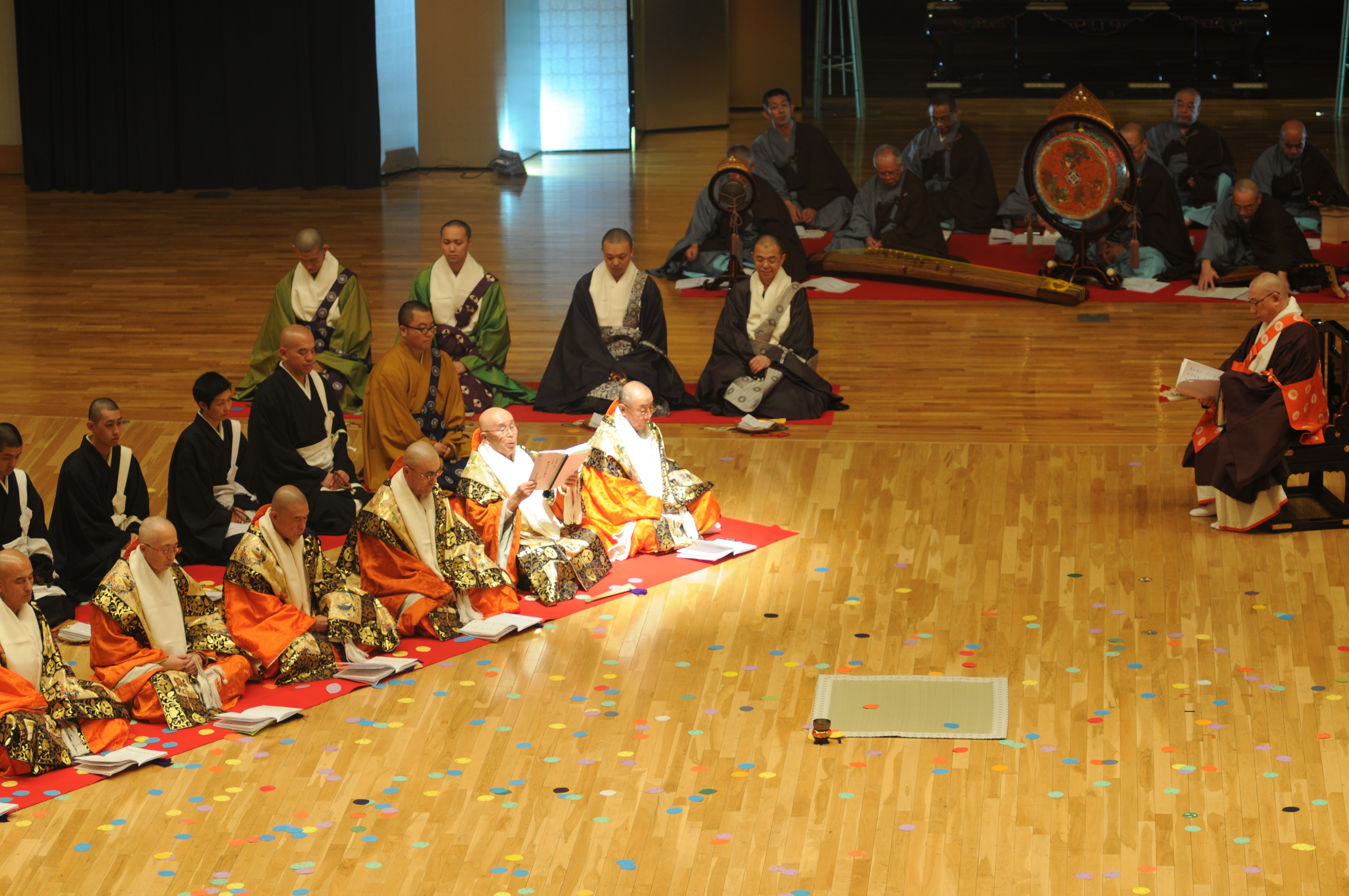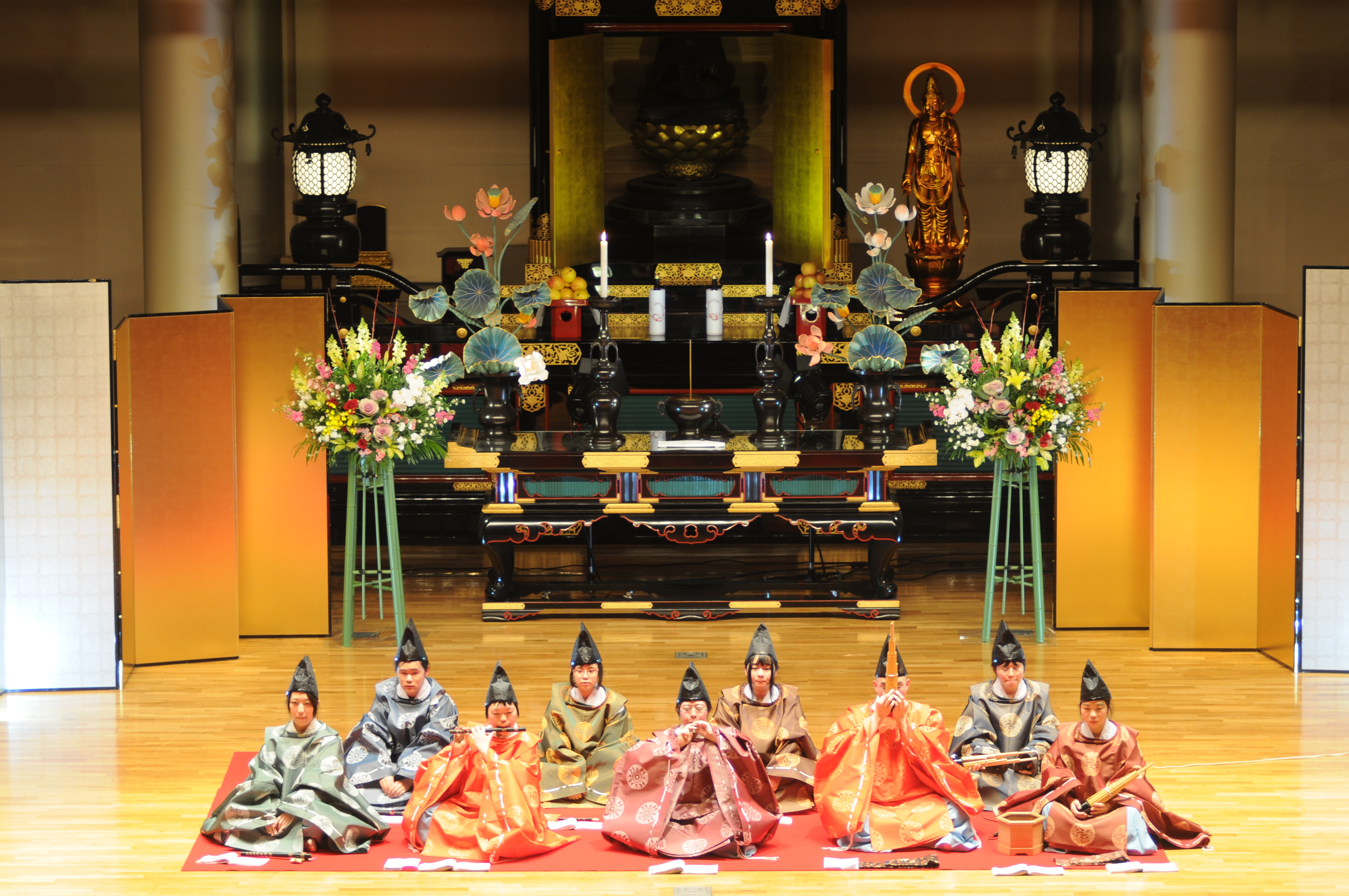 本年度は、「浄仏国土~山門と盛門~」と題して、仏さまへのいのりを中心とした内容を、第一部では天台宗の法華三昧、第二部では天台真盛宗とのコラボレーションにて公演しました。そこで行われた真盛宗による管絃講 順次往生講式は、八百年前、平安時代後期に叡山の僧侶真源によって作られたものです。この講式は声のみ声楽曲ではなく、雅楽の曲と合奏され得るように作られており、いわば管絃楽伴奏付きの交声曲のような講式です。