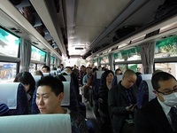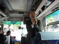 写真は出発直後の林田先生のご挨拶、および車中の様子です。