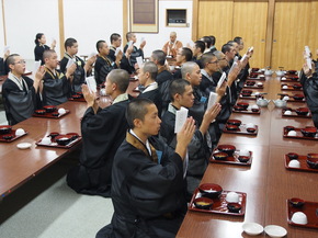 この研修中の食事も、修行と同様のもので、食前・食後には「いただきます」「ごちそうさまでした」の意味をこめてお経(斉食儀)をお唱えします。また、食事の間、食器を置く音、汁をすする音などすべての音を立てることが禁止されており、学生は音を出さないように細心の注意を払って食事をします。さらに、食べ終わった食器をたくわんとお茶で綺麗に洗い(洗鉢)、そのお茶を飲み干し、わずかな食べ物ものこさないようにする、本来の作法に則って行われます。当然、食べ物の好き嫌いは言えませんし、おしゃべりもできません。