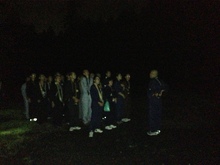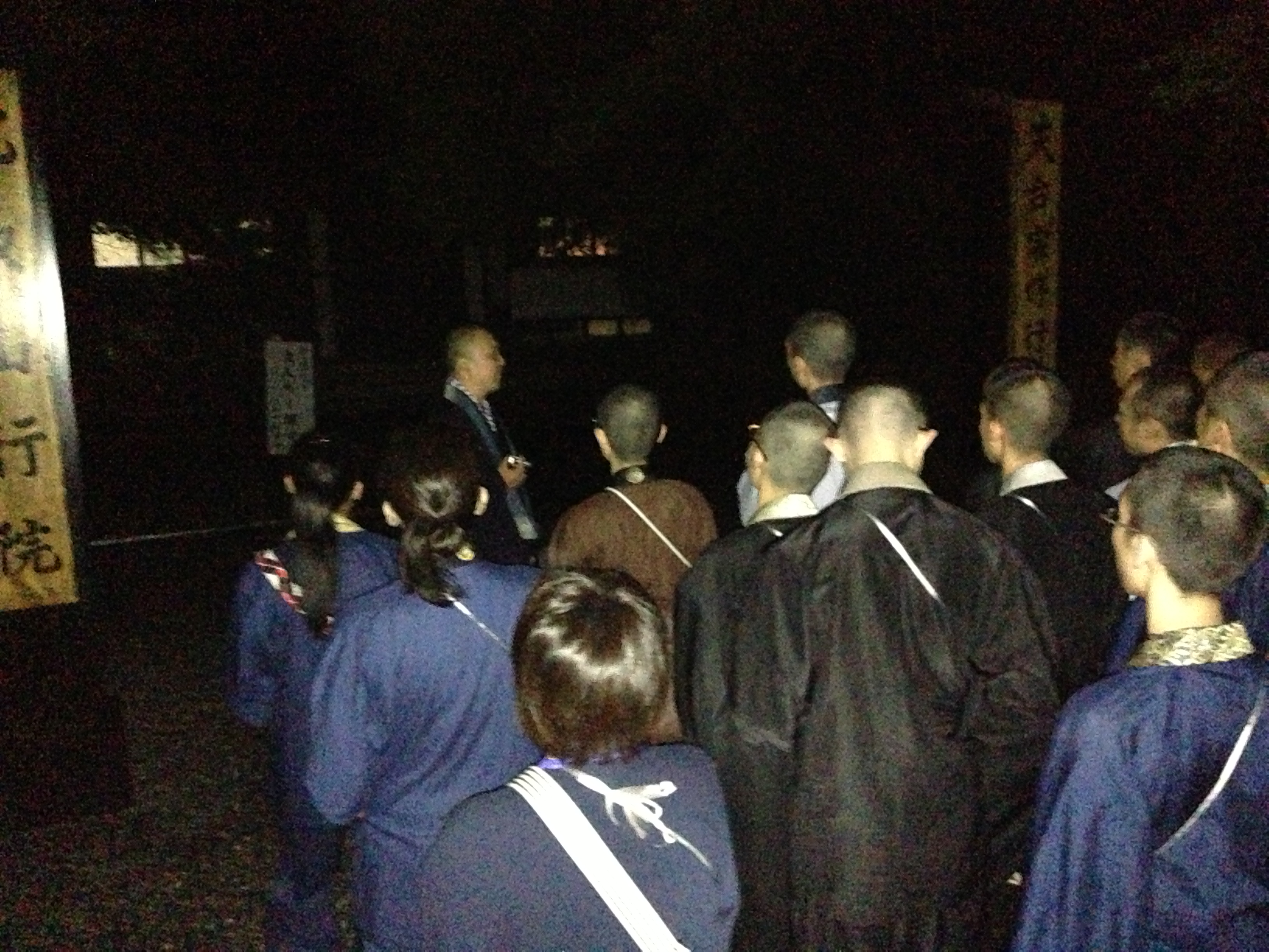 さらに、この研修では、回峰行を体験します。回峰行は比叡山の峰々をめぐり、山中のさまざまなお堂を巡拝する修行です。この研修でも実際の回峰行と同様に夜中から始めます。夜中の二時に起床して、西塔の釈迦堂から横川へ、横川から比叡山を下って、ふもとの坂本の伝教大師が産湯を使ったという生源寺、それから無動寺坂を上り、山中・東塔の根本中堂などをお参りし、また西塔の居士林へ戻ります。