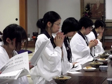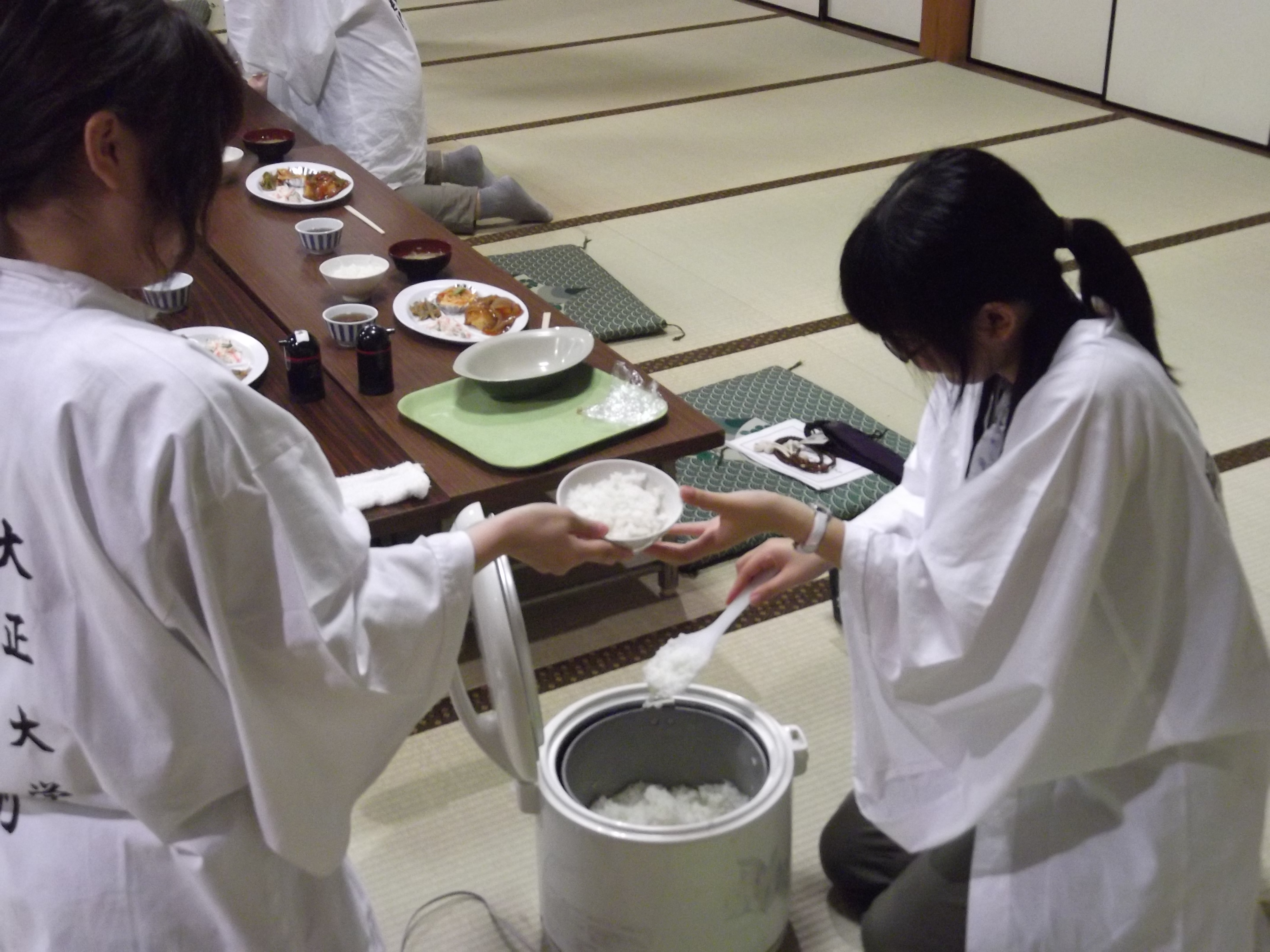 食事は全て精進料理です。配膳は学生が行い、食事の前には食事作法が、夕食事後には施餓鬼作法が行われます。