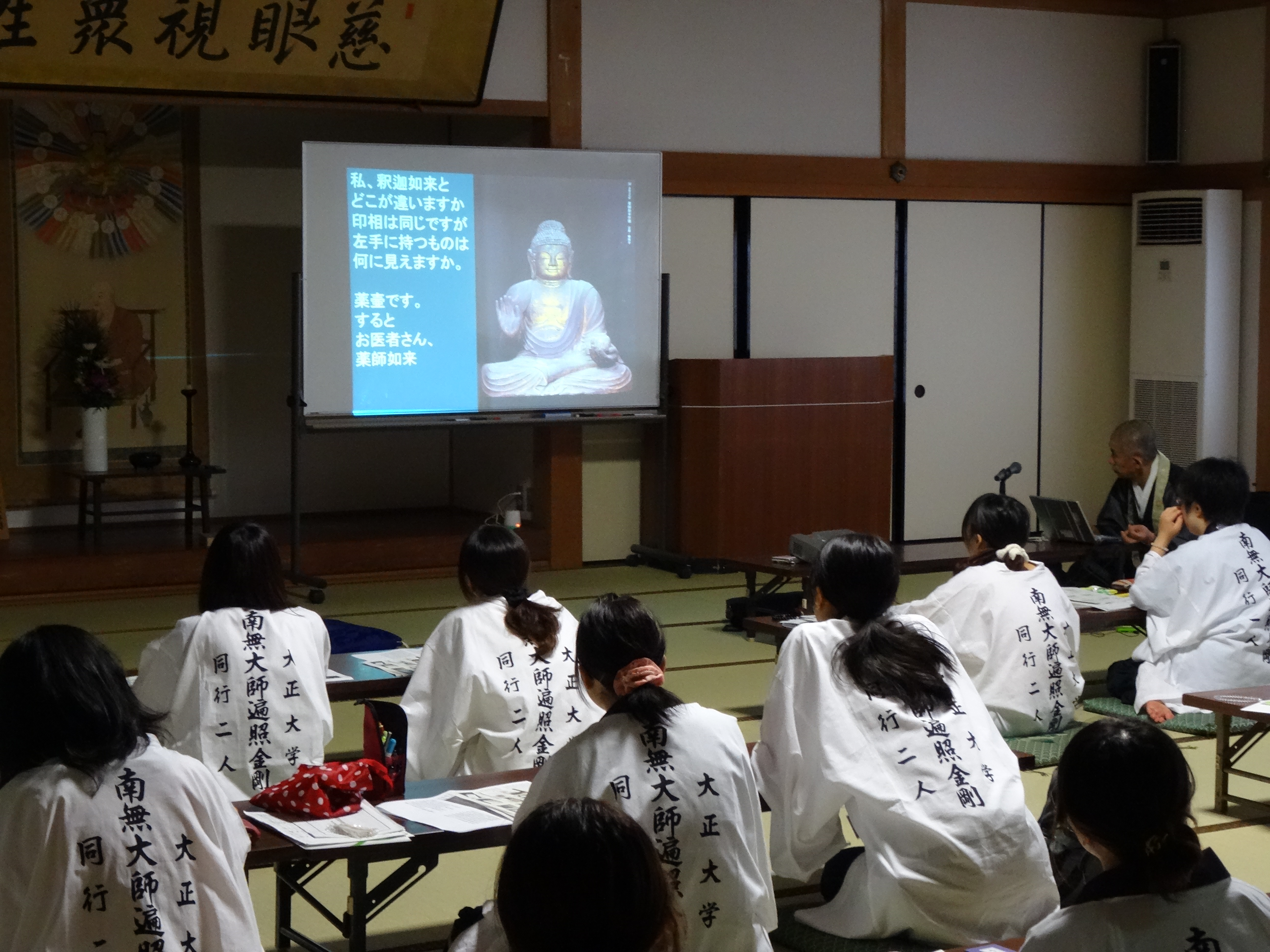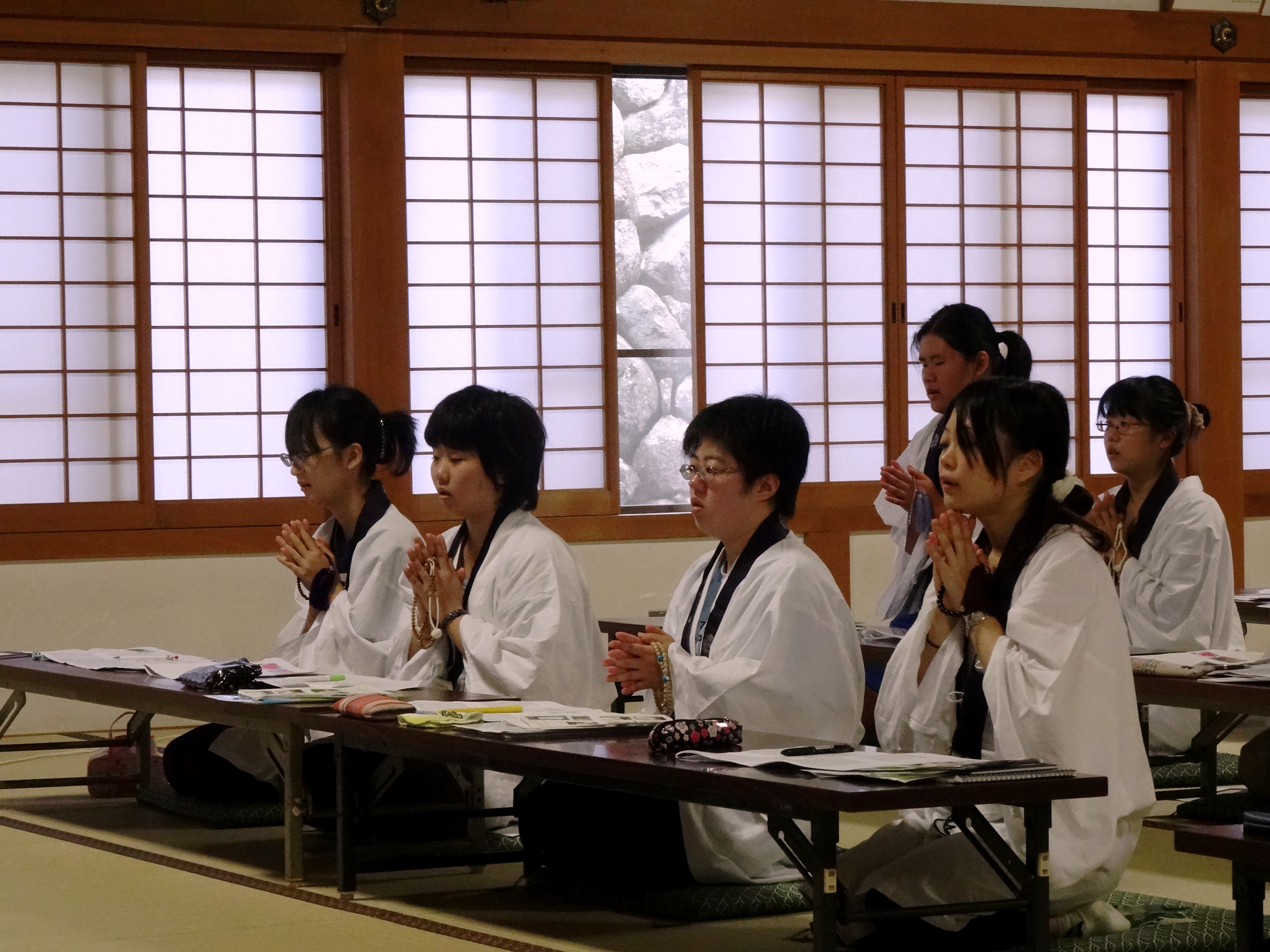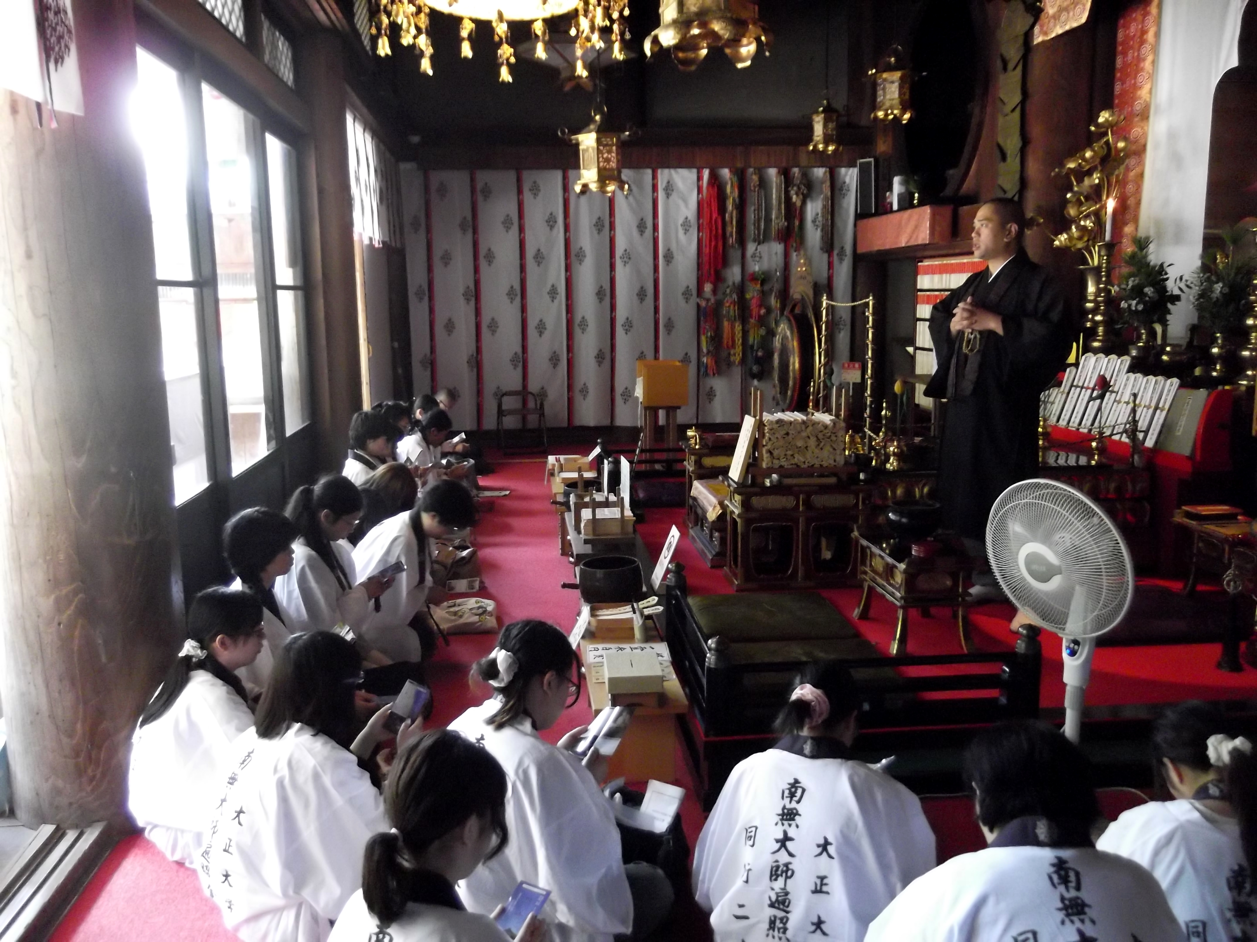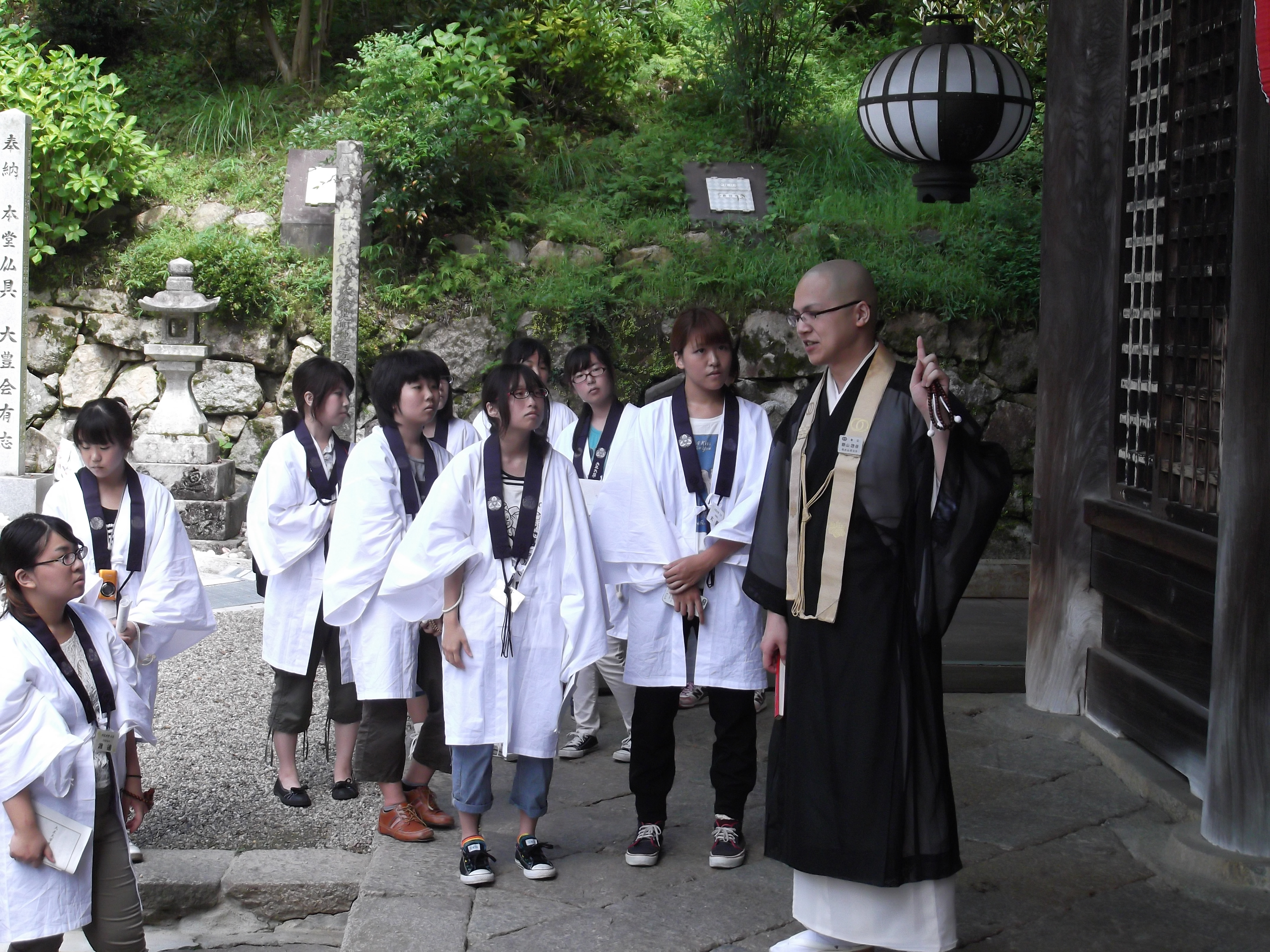 朝の勤行に始まり、掃除、食事の用意、そして9時から講義や山内の諸堂参拝、写経などなど、夜までびっしりとプログラムが組まれています。正座や仏教に関する授業や話など慣れない点も多かったと思いますが、それでも学生の皆さんは、一生懸命講義を聞いていましたし、班ごとでの行動や集合時間をきちんと守るといった基本的な事から、各プログラムでの積極的な行動など、仏教を体験することを通じて、自分自身を磨こうという姿勢が非常に伝わってきました。