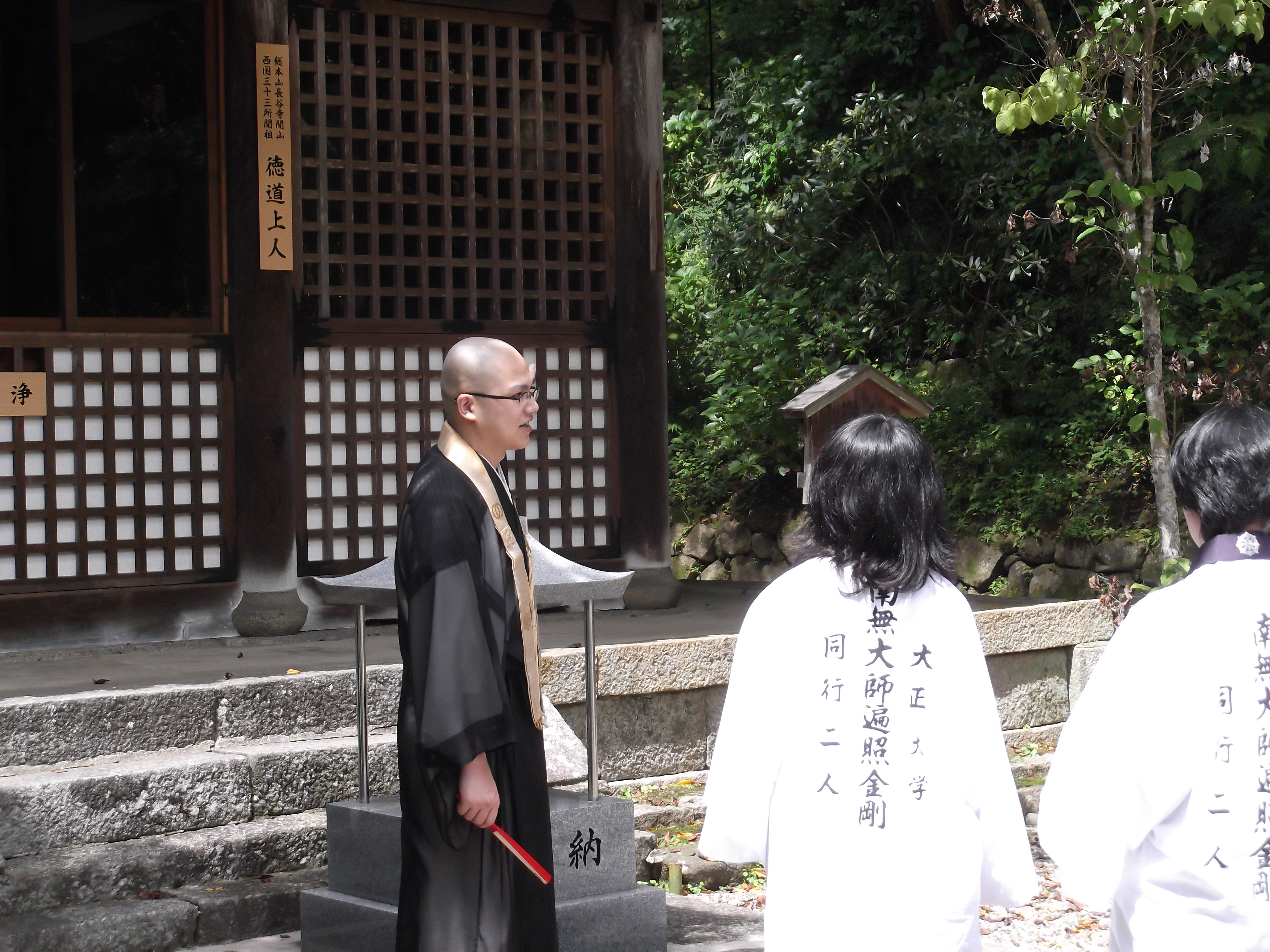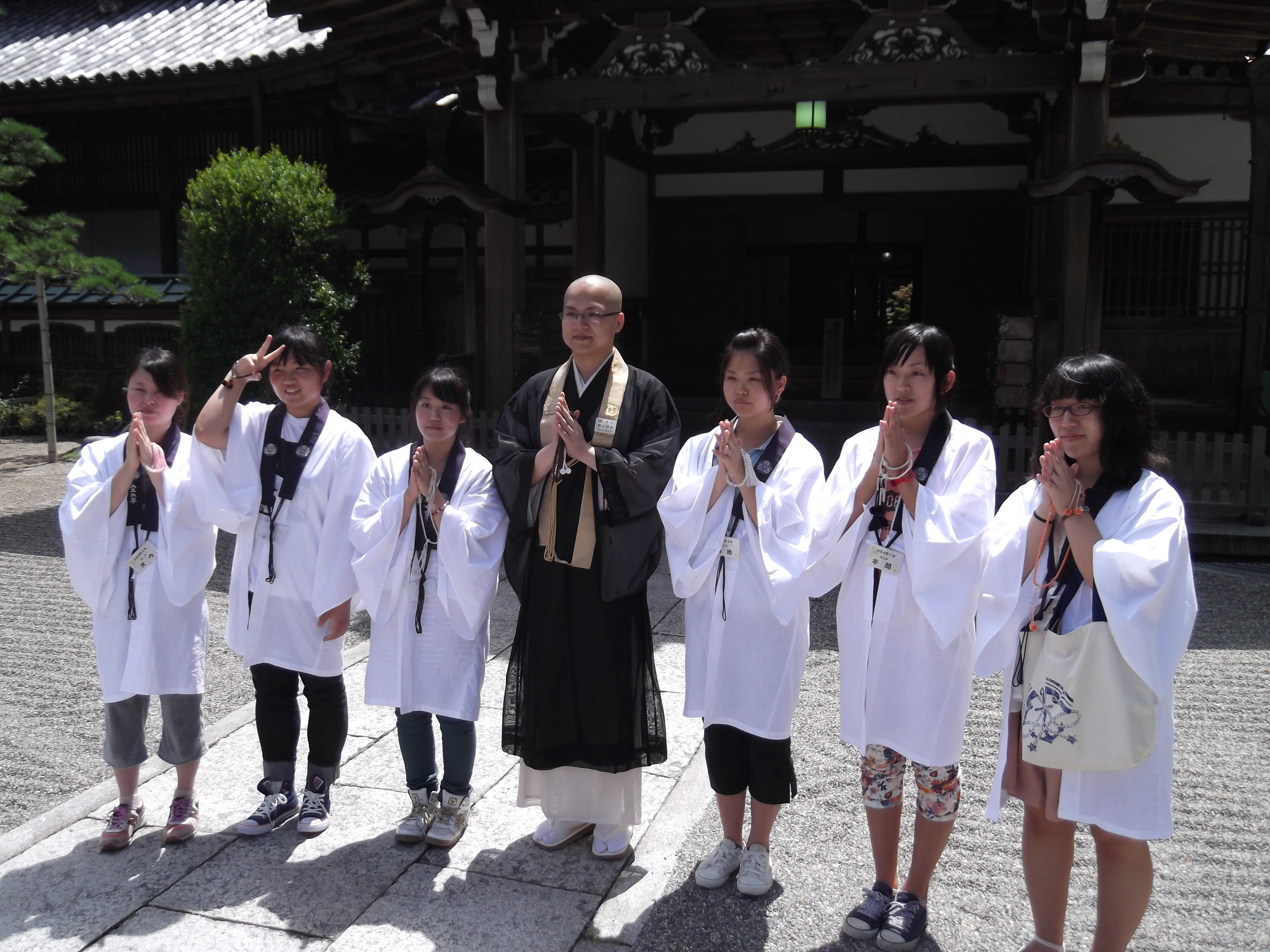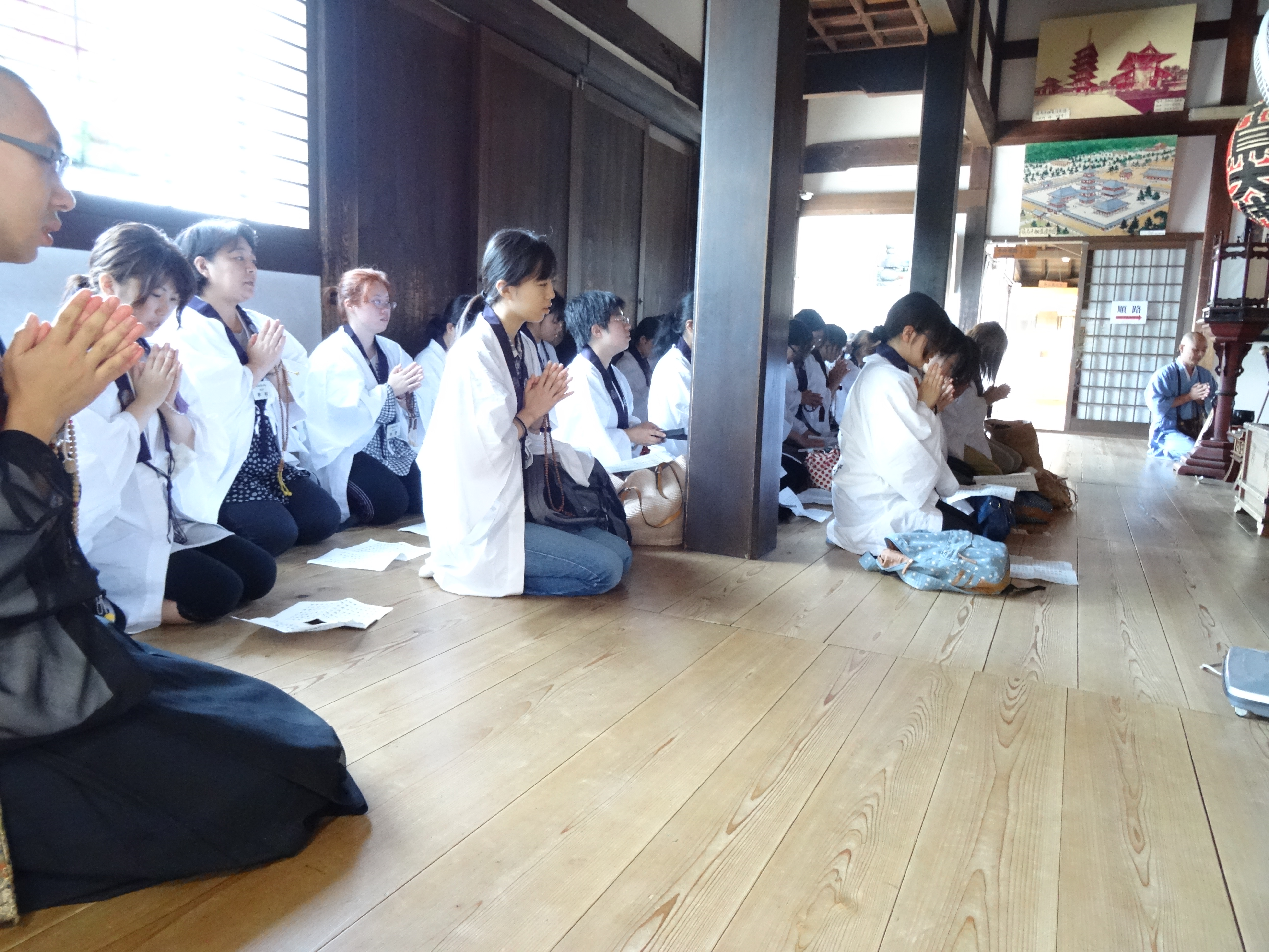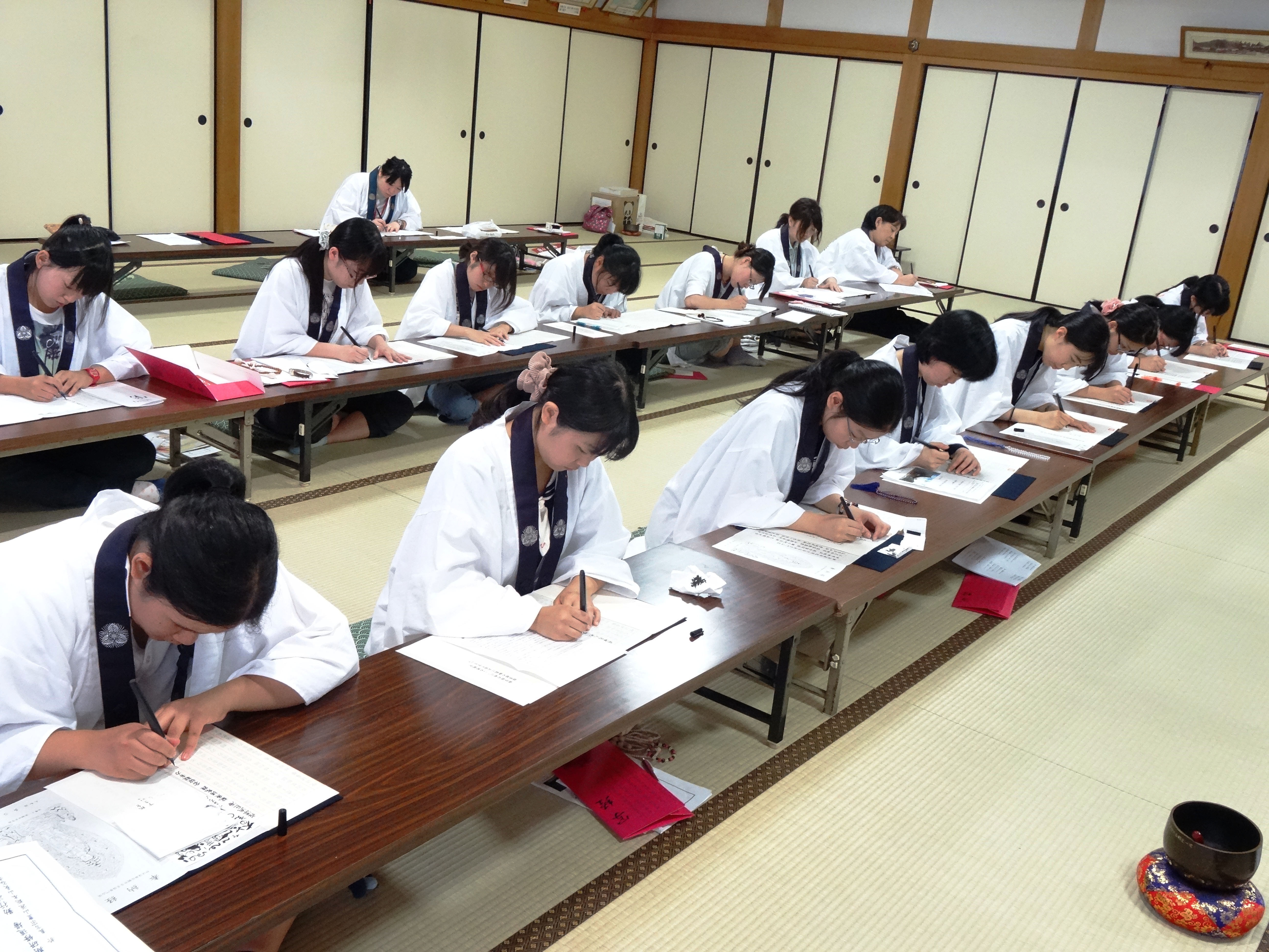 朝の勤行に始まり、掃除、食事の用意、そして9時から講義や山内の諸堂参拝、写経などなど、夜までびっしりとプログラムが組まれています。正座や仏教に関する授業や話など慣れない点も多かったと思いますが、それでも学生の皆さんは、一生懸命講義を聞いていましたし、班ごとでの行動や集合時間をきちんと守るといった基本的な事から、各プログラムでの積極的な行動など、仏教を体験することを通じて、自分自身を磨こうという姿勢が非常に伝わってきました。